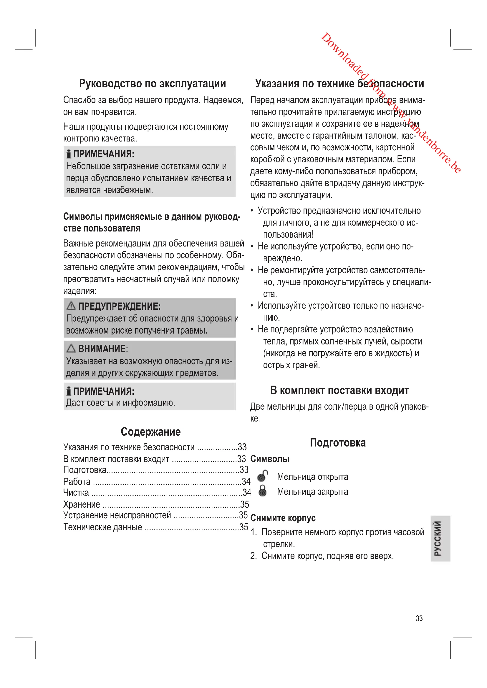 - Не подвергайте устройство воздействию тепла, прямых солнечных лучей, сырости (никогда не погружайте его в жидкость) и острых граней. В комплект поставки входит Две мельницы для соли/перца в одной упаков-
