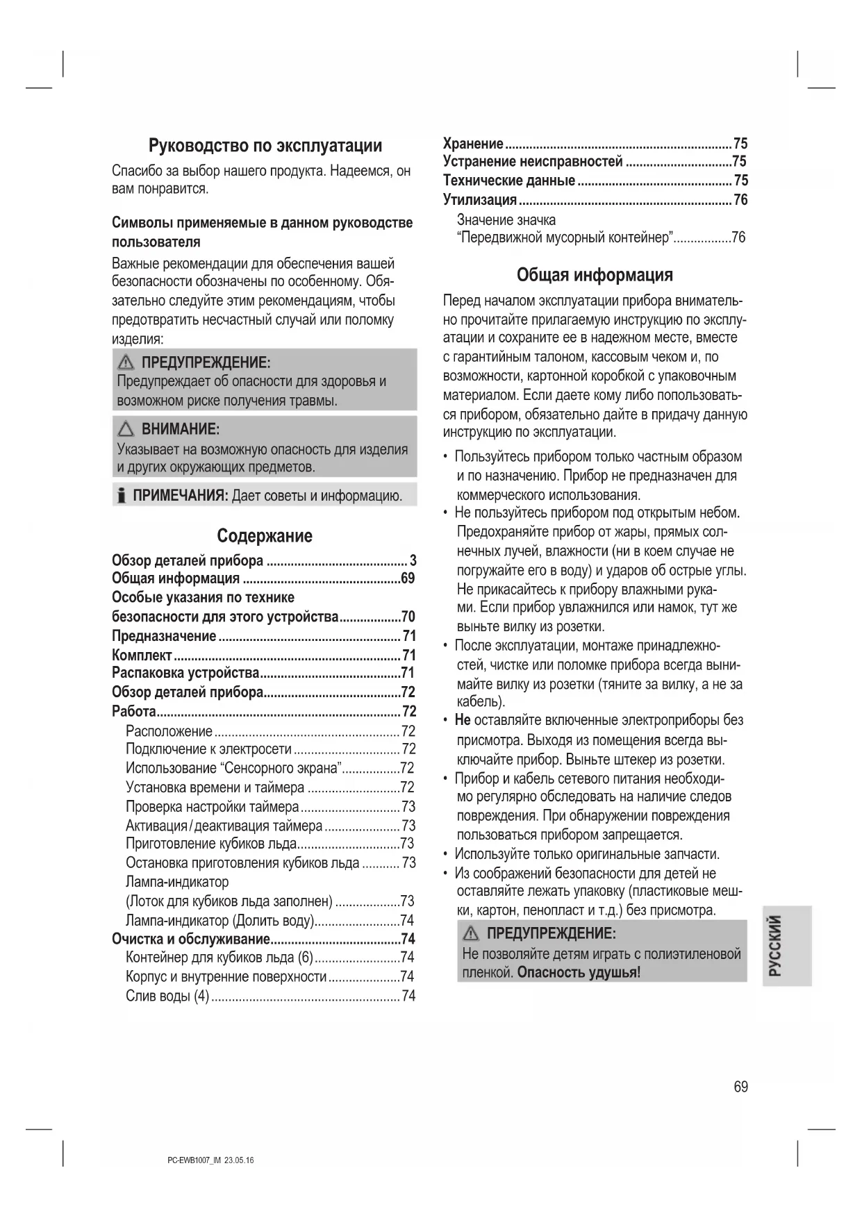 - Не пытайте отремонтировать устройство самостоятельно. Обя- зательно свяжитесь с авторизованным мастером. При повреж- дении сетевого шнура, во избежание опасности поражения электрическим током, шнур следует заменить у изготовителя, сервисного представителя или других квалифицированных лиц.71 PC-EWB1007_IM 23.05.16