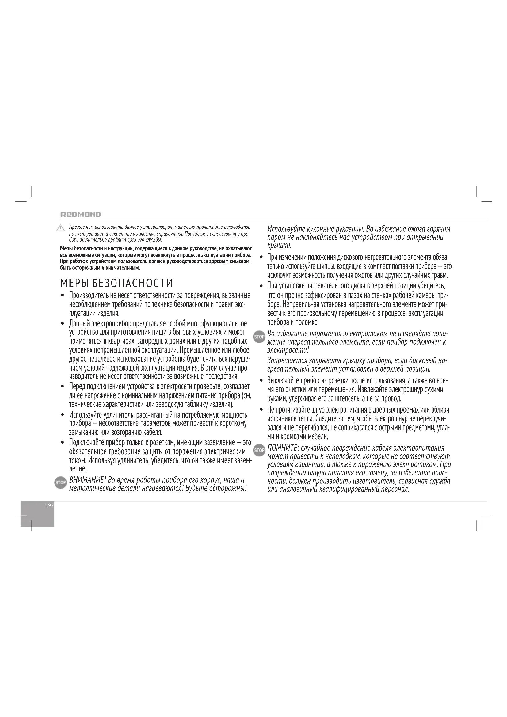 ВНИМАНИЕ! Во время работы прибора его корпус, чаша и металлические детали нагреваются! Будьте осторожны! Используйте кухонные рукавицы. Во избежание ожога горячим паром не наклоняйтесь над устройством при открывании