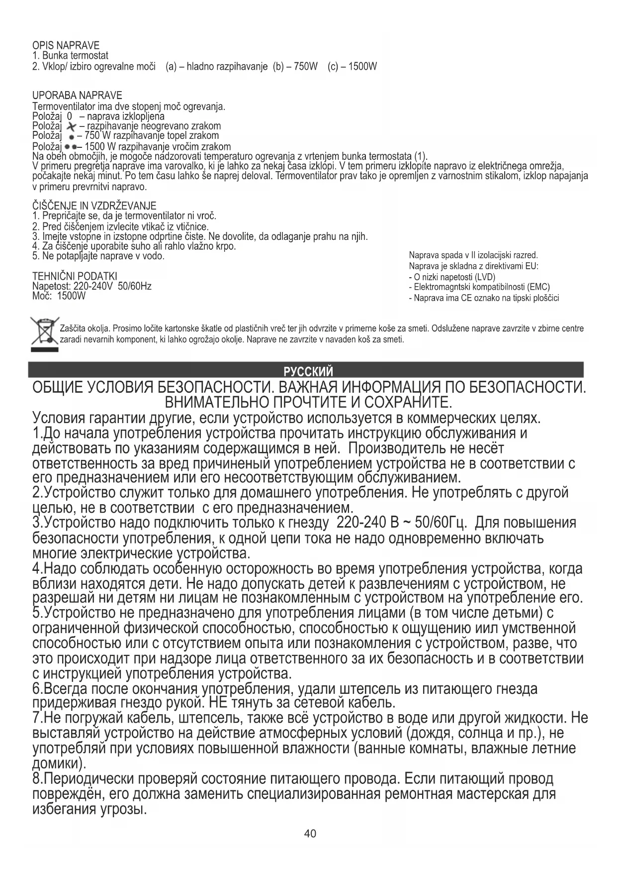 ИСПОЛЬЗОВАНИЕ УСТРОЙСТВА Тепловентилятор имеет две степени мощности нагрева. Положение 0 - устройство выключено Положение - вентилятор (поток холодного воздуха) Положение - 750 Вт теплый воздух Положение - 1500 Вт горячий воздух В обеих положениях, можно контролировать температуру нагрева с помощью регулятора термостата (1). В случае перегрева, устройство имеет автоматический термопредохранитель, который отключит устройство на некоторое время. В этом случае, отключите устройство от сети и подождите несколько минут. По истечении этого времени вы можете продолжать эксплуатацию. Тепловентилятор оснащен также предохранительным выключателем, который отключает питание в случае падения устройства. ОЧИСТКА И ОБСЛУЖИВАНИЕ