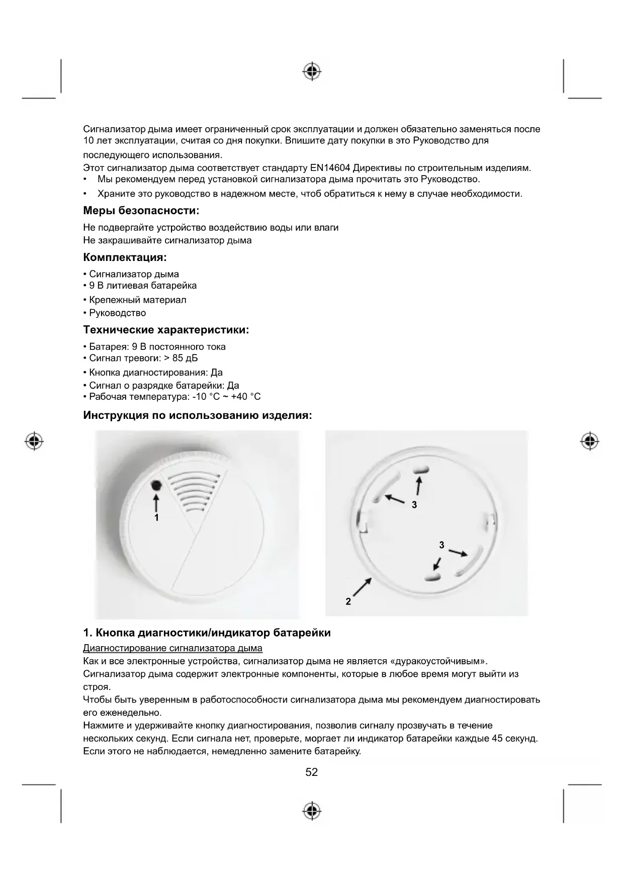 - Храните это руководство в надежном месте, чтоб обратиться к нему в случае необходимости. Меры безопасности: Не подвергайте устройство воздействию воды или влаги Не закрашивайте сигнализатор дыма Комплектация: