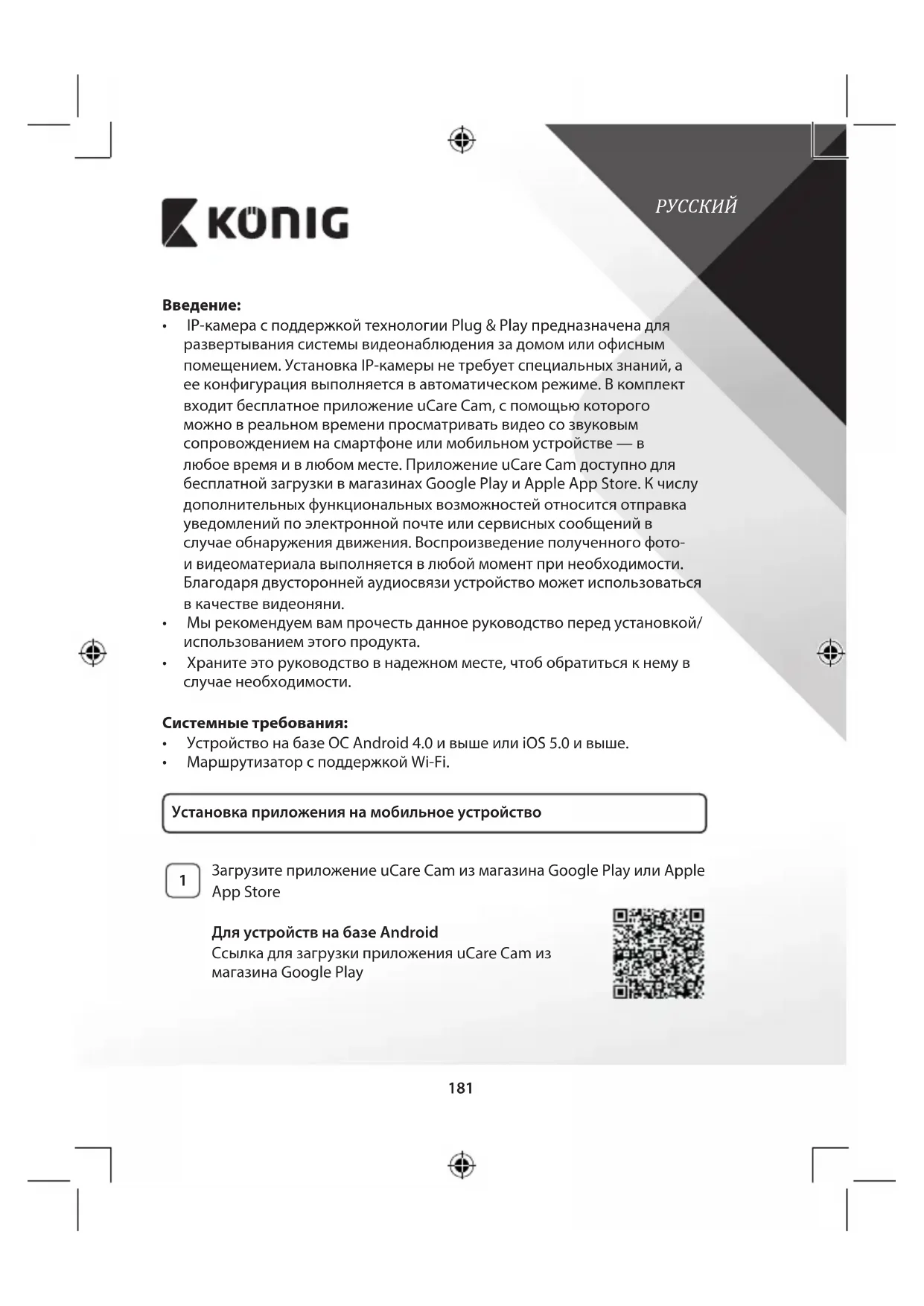 - IP-камерасподдержкойтехнологииPlug&Playпредназначенадля развертываниясистемывидеонаблюдениязадомомилиофисным помещением.УстановкаIP-камерынетребуетспециальныхзнаний,а ееконфигурациявыполняетсявавтоматическомрежиме.Вкомплект входитбесплатноеприложениеuCareCam,спомощьюкоторого можновреальномвременипросматриватьвидеосозвуковым сопровождениемнасмартфонеилимобильномустройстве—в любоевремяивлюбомместе.ПриложениеuCareCamдоступнодля бесплатнойзагрузкивмагазинахGooglePlayиAppleAppStore.Кчислу дополнительныхфункциональныхвозможностейотноситсяотправка уведомленийпоэлектроннойпочтеилисервисныхсообщенийв случаеобнаружениядвижения.Воспроизведениеполученногофото- ивидеоматериалавыполняетсявлюбоймоментпринеобходимости. Благодарядвустороннейаудиосвязиустройствоможетиспользоваться вкачествевидеоняни.