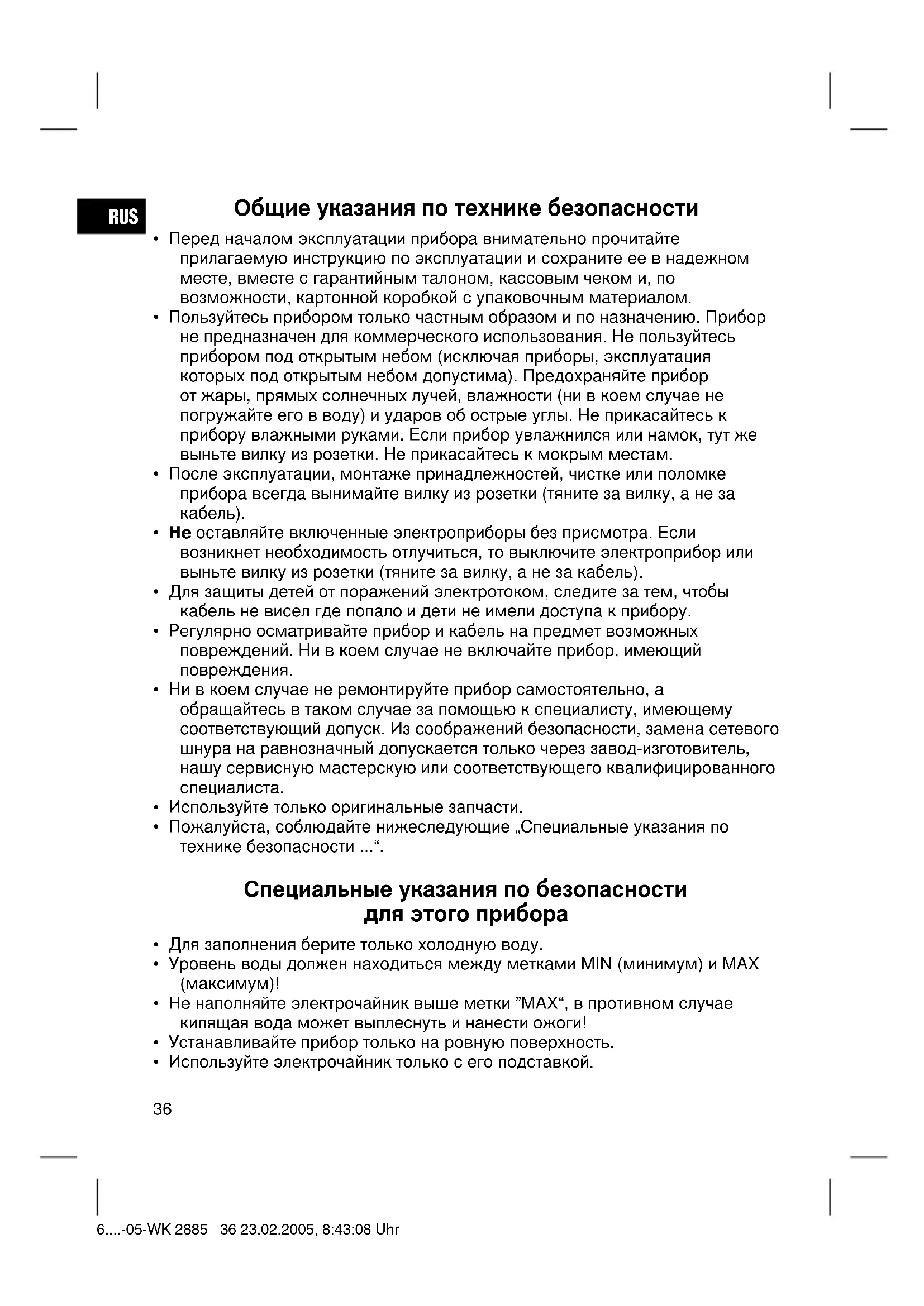 - Используйте электрочайник только с его подставкой. 6....-05-WK 2885 36 23.02.2005, 8:43:08 UhrRUS