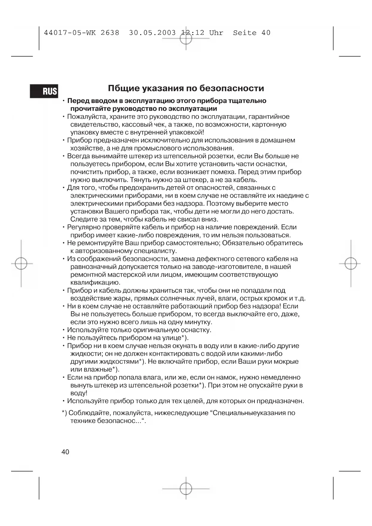 RUS 44017-05-WK 2638 30.05.2003 12:12 Uhr Seite 40Специальные указания по безопасности для этого