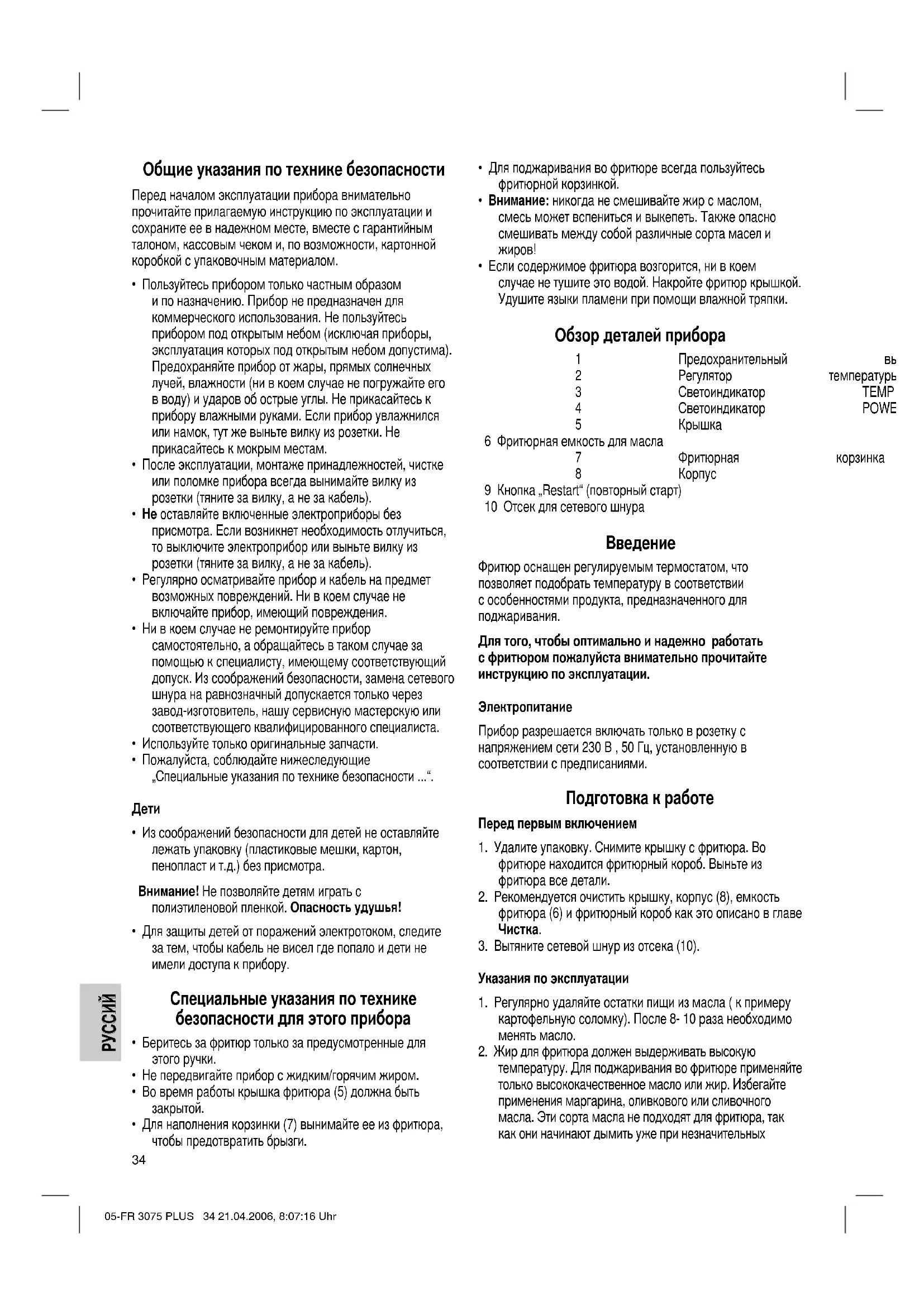 температуру. Для поджаривания во фритюре применяйте только высококачественное масло или жир. Избегайте применения маргарина, оливкового или сливочного масла. Эти сорта масла не подходят для фритюра, так как они начинают дымить уже при незначительных 05-FR 3075 PLUS 34 21.04.2006, 8:07:16 UhrРУССИЙ