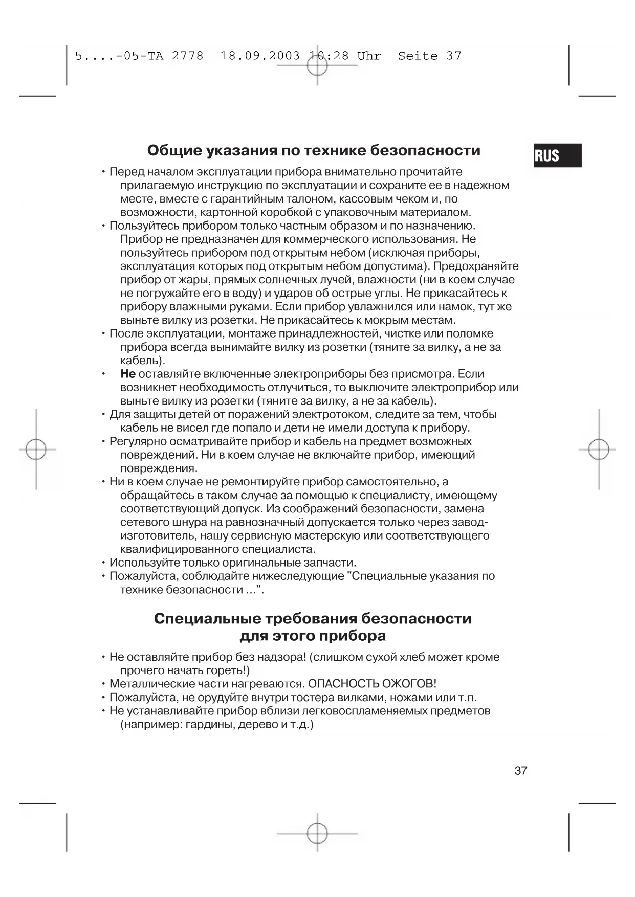 • Пожалуйста, не орудуйте внутри тостера вилками, ножами или т.п. - Не устанавливайте прибор вблизи легковоспламеняемых предметов (например: гардины, дерево и т.д.)