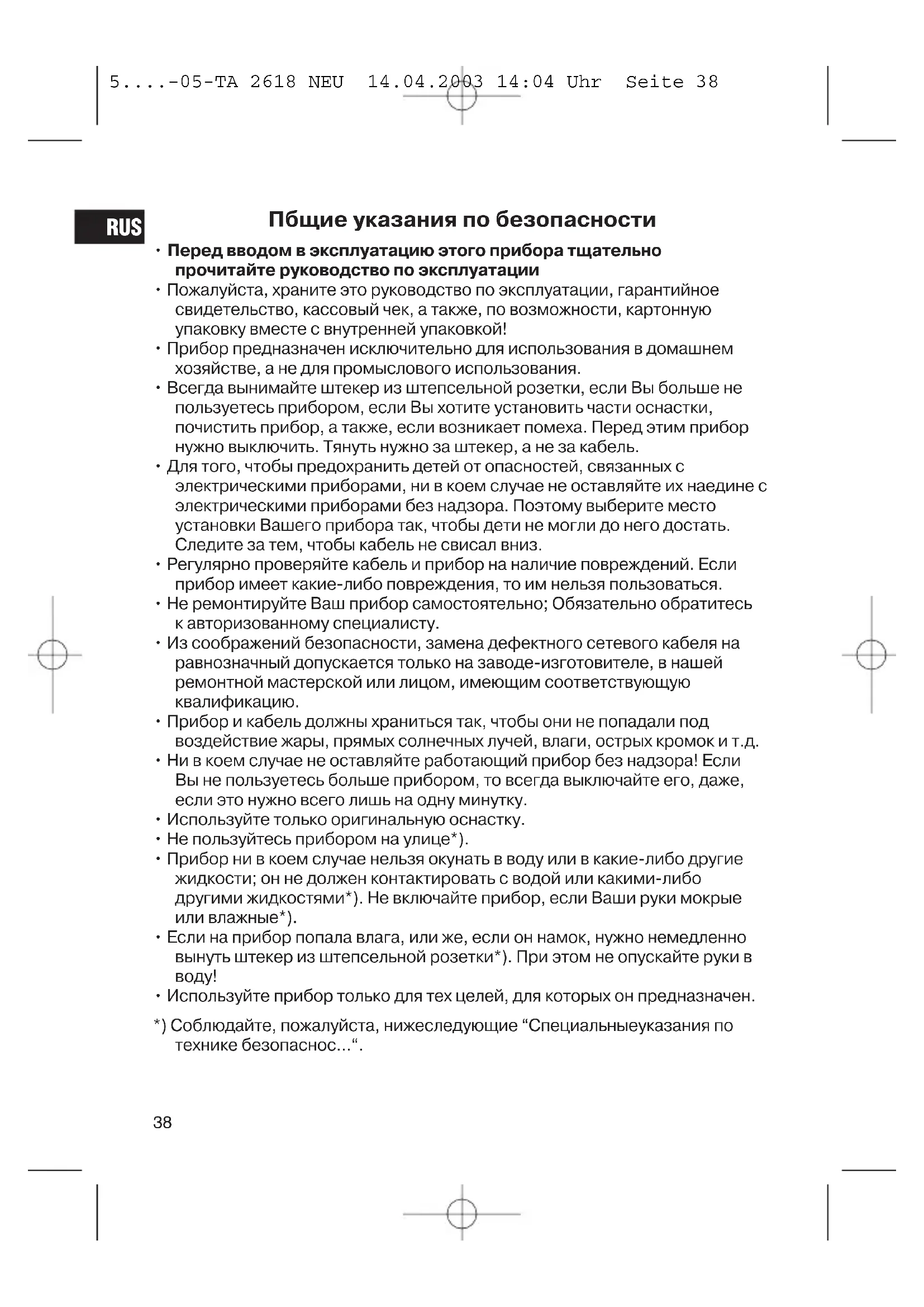 RUS 5....-05-TA 2618 NEU 14.04.2003 14:04 Uhr Seite 38Специальные требования безопасности для этого
