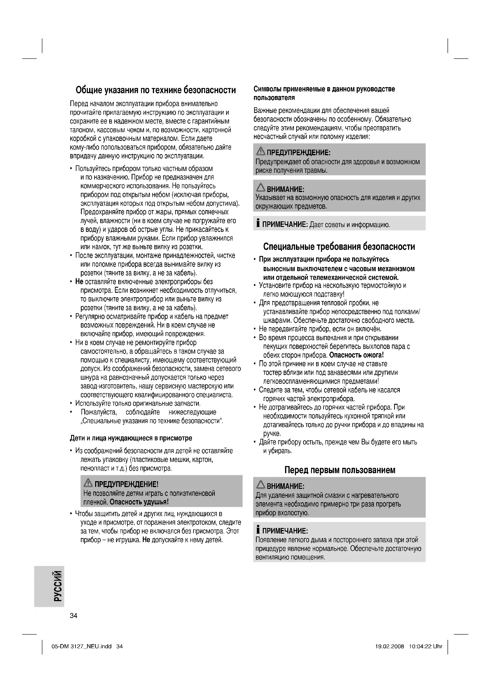 Для удаления защитной смазки с нагревательного элемента необходимо примерно три раза прогреть прибор вхолостую. ПРИМЕЧАНИЕ: Появление легкого дыма и постороннего запаха при этой прицедуре явление нормальное. Обеспечьте достаточную вентиляцию помещения. 05-DM 3127_NEU.indd 3405-DM 3127_NEU.indd 34 19.02.2008 10:04:22 Uhr19.02.2008 10:04:22 Uhr35