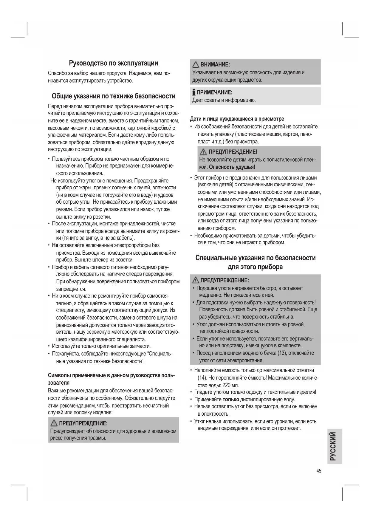 - Утюг нельзя использовать, если его уронили, если есть видимые повреждения, или если он протекает.46