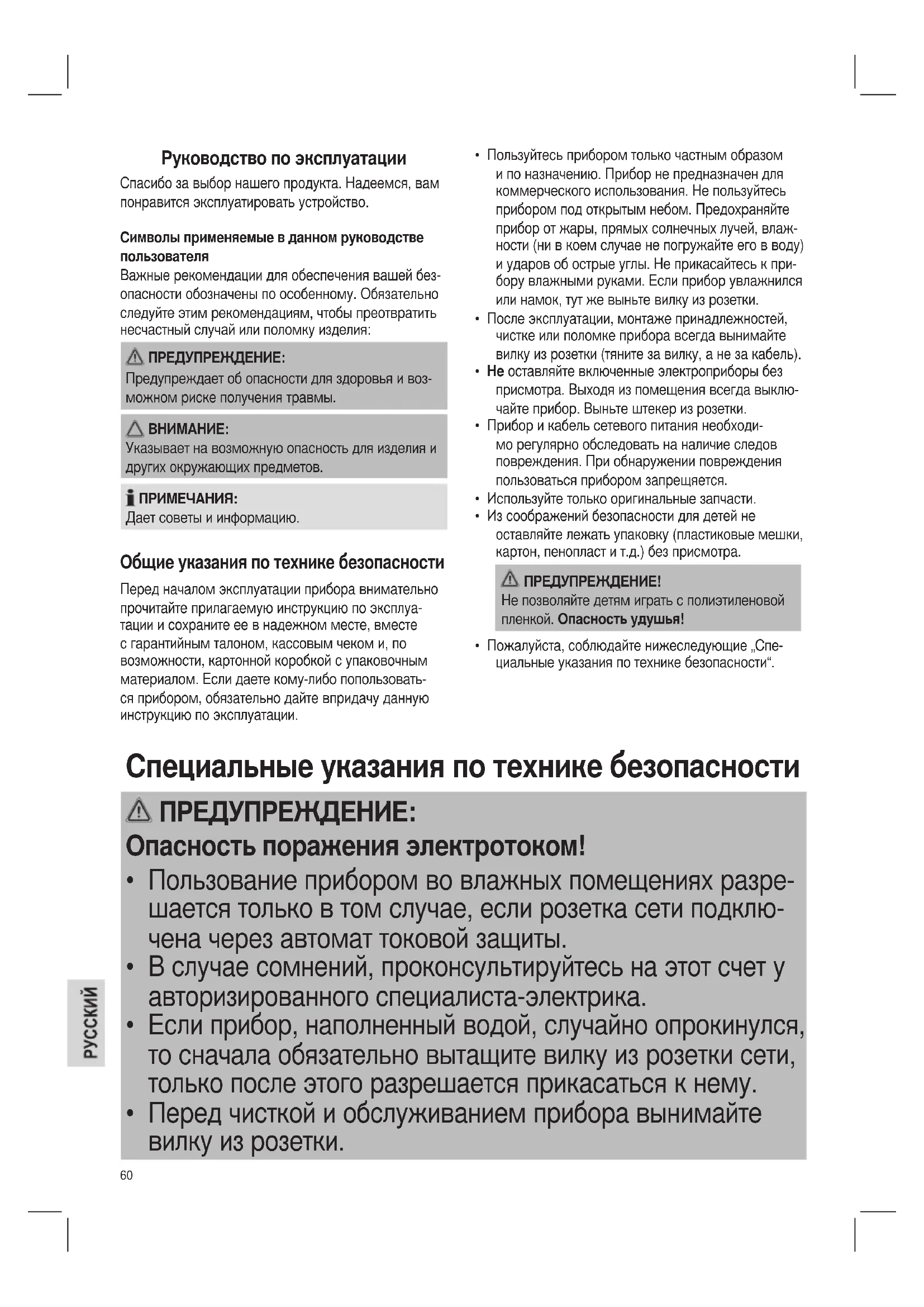 Указывает на возможную опасность для изделия и других окружающих предметов. ПРИМЕЧАНИЯ: Дает советы и информацию. Общие указания по технике безопасности Перед началом эксплуатации прибора внимательно прочитайте прилагаемую инструкцию по эксплуа- тации и сохраните ее в надежном месте, вместе с гарантийным талоном, кассовым чеком и, по возможности, картонной коробкой с упаковочным материалом. Если даете кому-либо попользовать- ся прибором, обязательно дайте впридачу данную инструкцию по эксплуатации. Специальные указания по технике безопасности ПРЕДУПРЕЖДЕНИЕ: Опасность поражения электротоком!