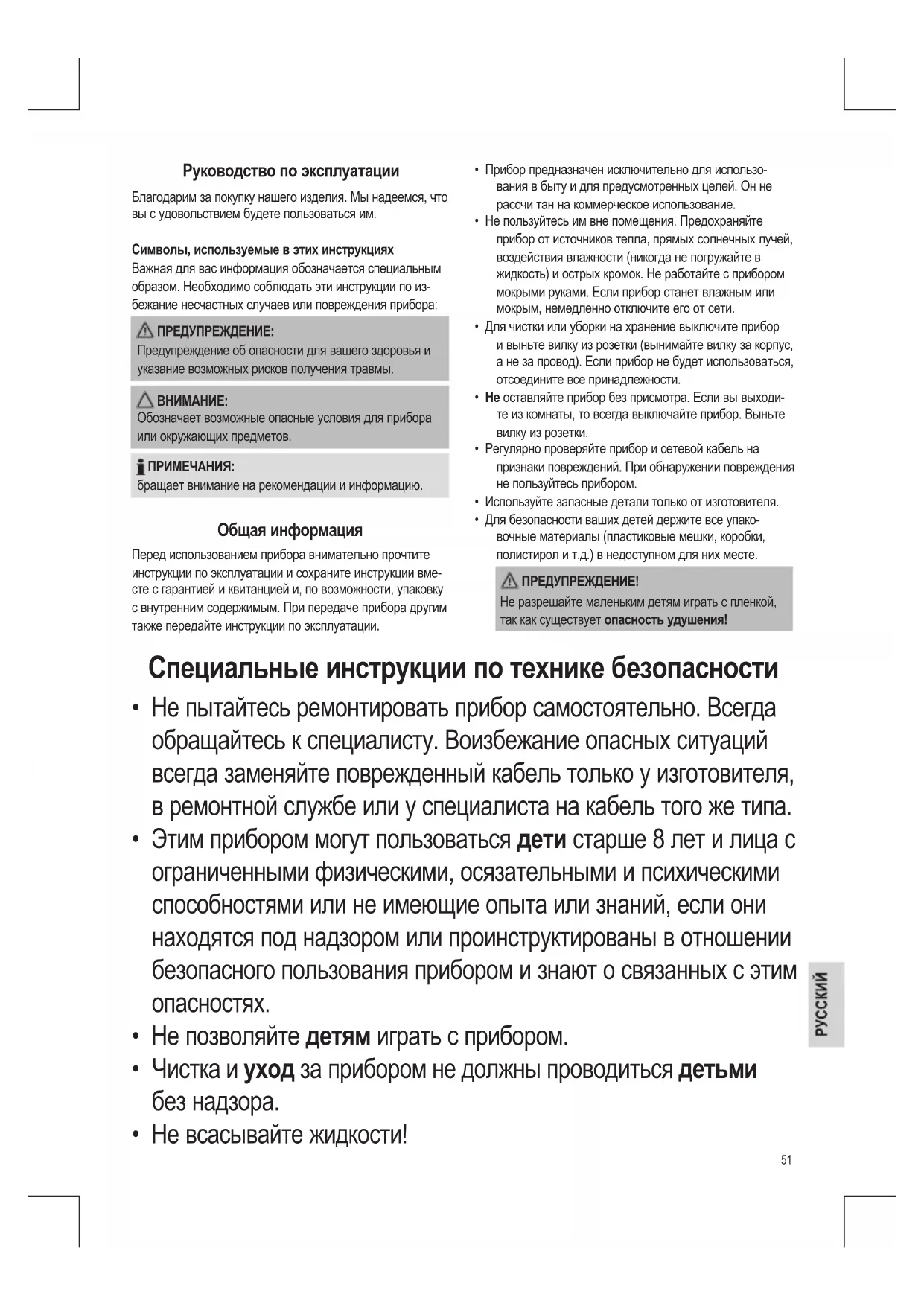 - Для безопасности ваших детей держите все упако- вочные материалы (пластиковые мешки, коробки, полистирол и т.д.) в недоступном для них месте. ПРЕДУПРЕЖДЕНИЕ! Не разрешайте маленьким детям играть с пленкой, так как существует опасность удушения! Руководство по эксплуатации Благодарим за покупку нашего изделия. Мы надеемся, что вы с удовольствием будете пользоваться им. Символы, используемые в этих инструкциях Важная для вас информация обозначается специальным образом. Необходимо соблюдать эти инструкции по из- бежание несчастных случаев или повреждения прибора: ПРЕДУПРЕЖДЕНИЕ: Предупреждение об опасности для вашего здоровья и указание возможных рисков получения травмы.