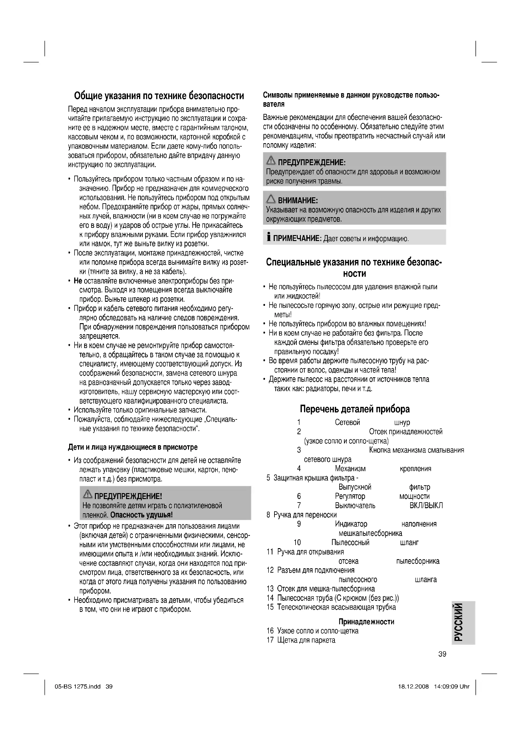 - Держите пылесос на расстоянии от источников тепла таких как: радиаторы, печи и т.д. Перечень деталей прибора 1 Сетевой шнур 2 Отсек принадлежностей (узкое сопло и сопло-щетка) 3 Кнопка механизма сматывания сетевого шнура 4 Механизм крепления 5 Защитная крышка фильтра - Выпускной фильтр 6 Регулятор мощности 7 Выключатель ВКЛ/ВЫКЛ 8 Ручка для переноски 9 Индикатор наполнения мешкапылесборника 10 Пылесосный шланг 11 Ручка для открывания отсека пылесборника 12 Разъем для подключения пылесосного шланга 13 Отсек для мешка-пылесборника 14 Пылесосная труба (С крюком (без рис.)) 15 Телескопическая всасывающая трубка Принадлежности 16 Узкое сопло и сопло-щетка 17 Щетка для паркета 05-BS 1275.indd 3905-BS 1275.indd 39 18.12.2008 14:09:09 Uhr18.12.2008 14:09:09 Uhr40