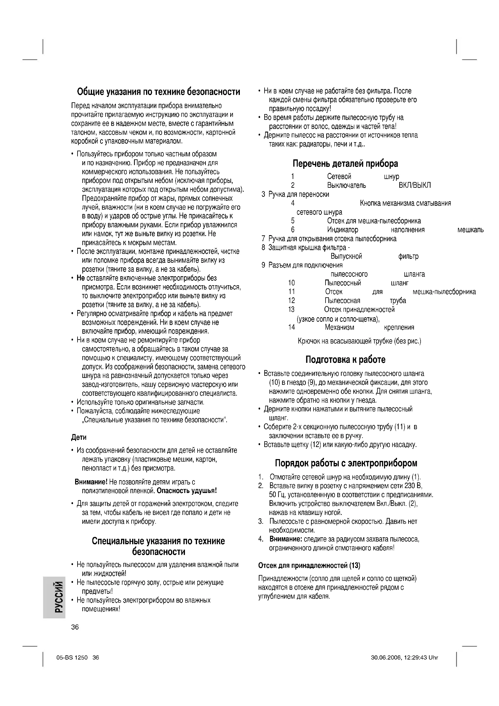 ограниченного длиной отмотанного кабеля! Отсек для принадлежностей (13) Принадлежности (сопло для щелей и сопло со щеткой) находятся в отсеке для принадлежностей рядом с углублением для кабеля. 05-BS 1250 36 30.06.2006, 12:29:43 UhrРУССИЙ