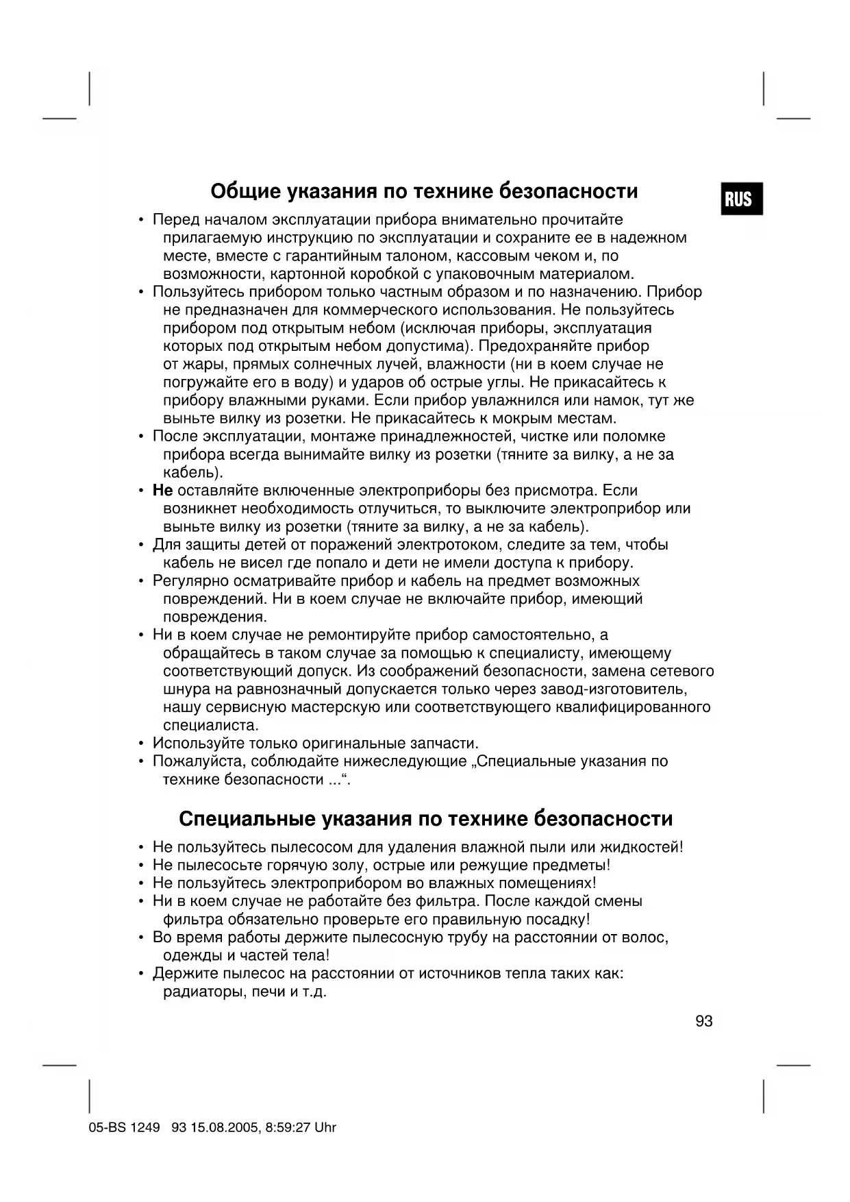 - Держите пылесос на расстоянии от источников тепла таких как: радиаторы, печи и т.д. 05-BS 1249 93 15.08.2005, 8:59:27 UhrRUS