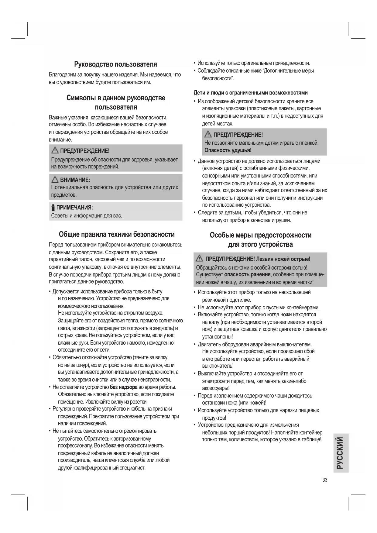 - Следите за детьми, чтобы убедиться, что они не используют прибор в качестве игрушки. Особые меры предосторожности для этого устройства ПРЕДУПРЕЖДЕНИЕ! Лезвия ножей острые! Обращайтесь с ножами с особой осторожностью! Существует опасность ранения, особенно при помеще- нии ножей в чашу, их извлечении и во время чистки!