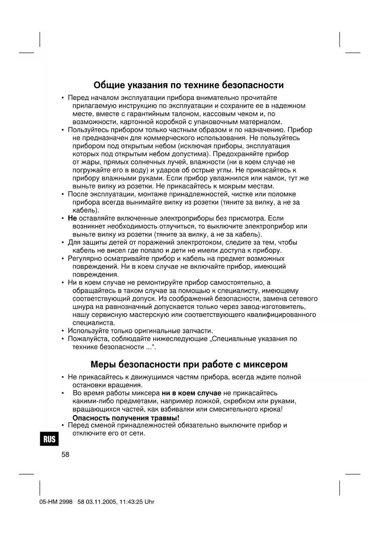 - Перед сменой принадлежностей обязательно выключите прибор и отключите его от сети. 05-HM 2998 58 03.11.2005, 11:43:25 UhrRUS