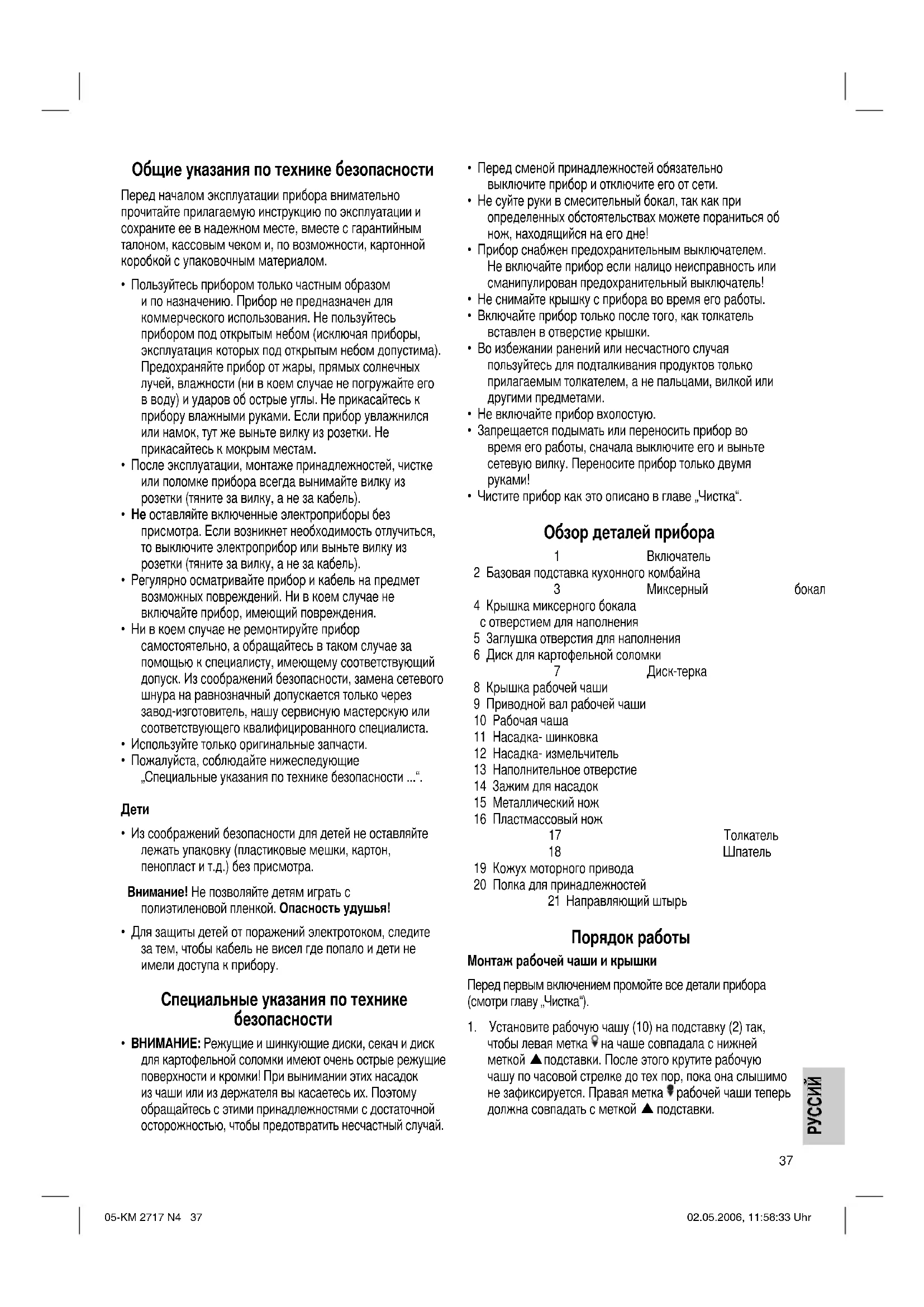 Двойная система безопасности: электромотор включается только в том случае, если крышка рабочей чаши правильно зафиксирована и, одновременно, миксерный бокал или кожух привода миксера (19) установлен на свое место. Снимайте крышку с чаши или миксерный бокал с подставки только при выключенном приборе. Порядок работы с миксером