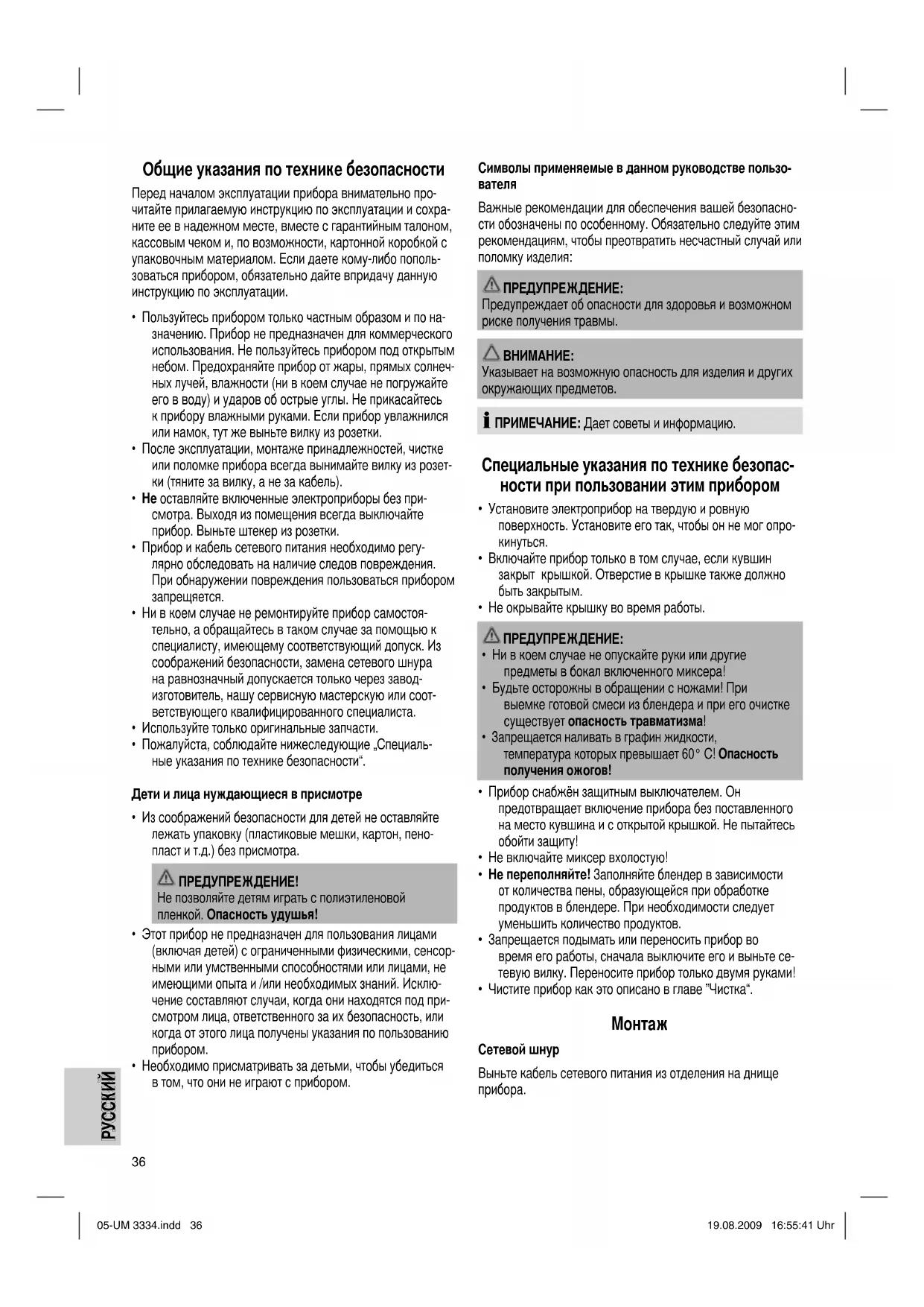 - Пожалуйста, соблюдайте нижеследующие „Специаль- ные указания по технике безопасности“. Дети и лица нуждающиеся в присмотре