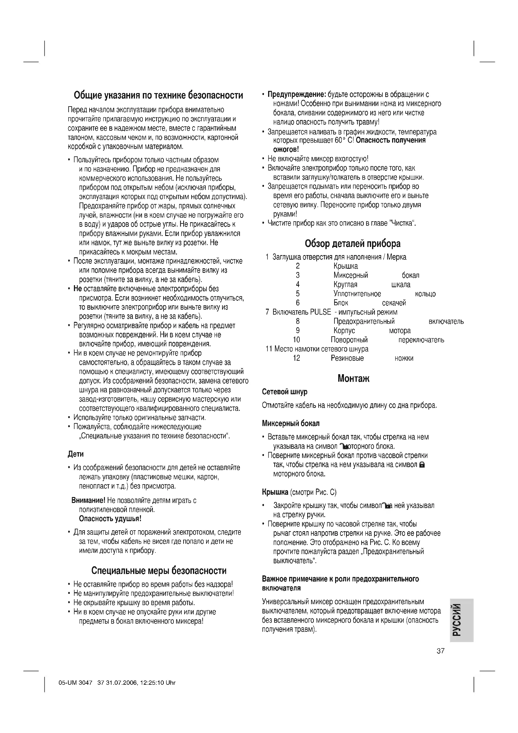 - Для хранения прибора намотайте сетевой шнкр на донышко и вставьте все детали в моторный блок. 05-UM 3047 38 31.07.2006, 12:25:12 UhrРУССИЙ