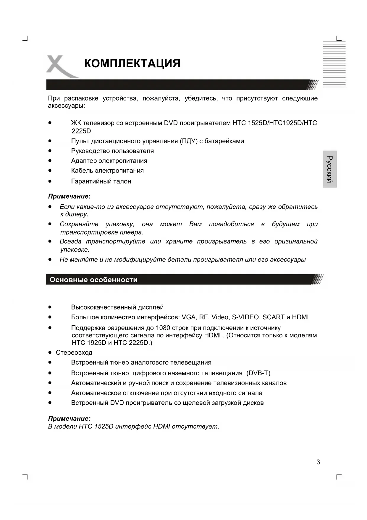 - Встроенный DVD проигрыватель со щелевой загрузкой дисков Примечание: В модели HTC 1525D интерфейс HDMI отсутствует. Основные особенности4