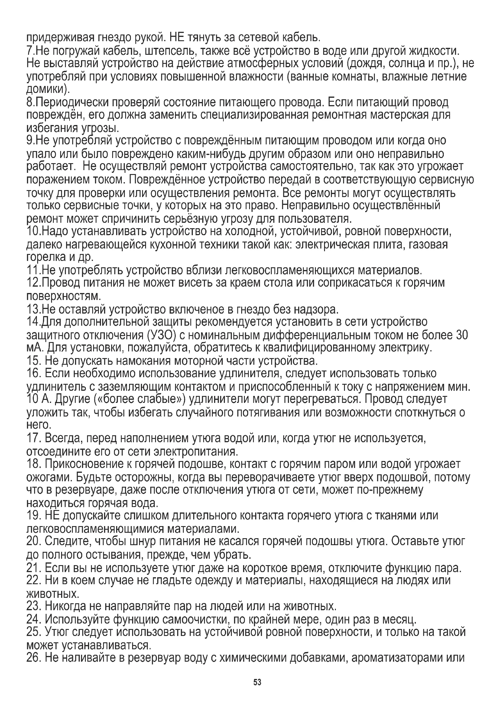 ОБЩИЕ УСЛОВИЯ БЕЗОПАСНОСТИ. ВАЖНАЯ ИНФОРМАЦИЯ ПО БЕЗОПАСНОСТИ. ВНИМАТЕЛЬНО ПРОЧТИТЕ И СОХРАНИТЕ. Условия гарантии другие, если устройство используется в коммерческих целях. 1.До начала употребления устройства прочитать инструкцию обслуживания и действовать по указаниям содержащимся в ней. Производитель не несёт ответственность за вред причиненый употреблением устройства не в соответствии с его предназначением или его несоответствующим обслуживанием. 2.Устройство служит только для домашнего употребления. Не употреблять с другой целью, не в соответствии с его предназначением. 3.Устройство надо подключить только к гнезду 220-240В ~50/60Гц. Для повышения безопасности употребления, к одной цепи тока не надо одновременно включать многие электрические устройства. 4.Надо соблюдать особенную осторожность во время употребления устройства, когда вблизи находятся дети. Не надо допускать детей к развлечениям с устройством, не разрешай ни детям ни лицам не познакомленным с устройством на употребление его. 5.Устройство не предназначено для употребления лицами (в том числе детьми) с ограниченной физической способностью, способностью к ощущению иил умственной способностью или с отсутствием опыта или познакомления с устройством, разве, что это происходит при надзоре лица ответственного за их безопасность и в соответствии с инструкцией употребления устройства. 6.Всегда после окончания употребления, удали штепсель из питающего гнезда 52придерживая гнездо рукой. НЕ тянуть за сетевой кабель. 7.Не погружай кабель, штепсель, также всё устройство в воде или другой жидкости. Не выставляй устройство на действие атмосферных условий (дождя, солнца и пр.), не употребляй при условиях повышенной влажности (ванные комнаты, влажные летние