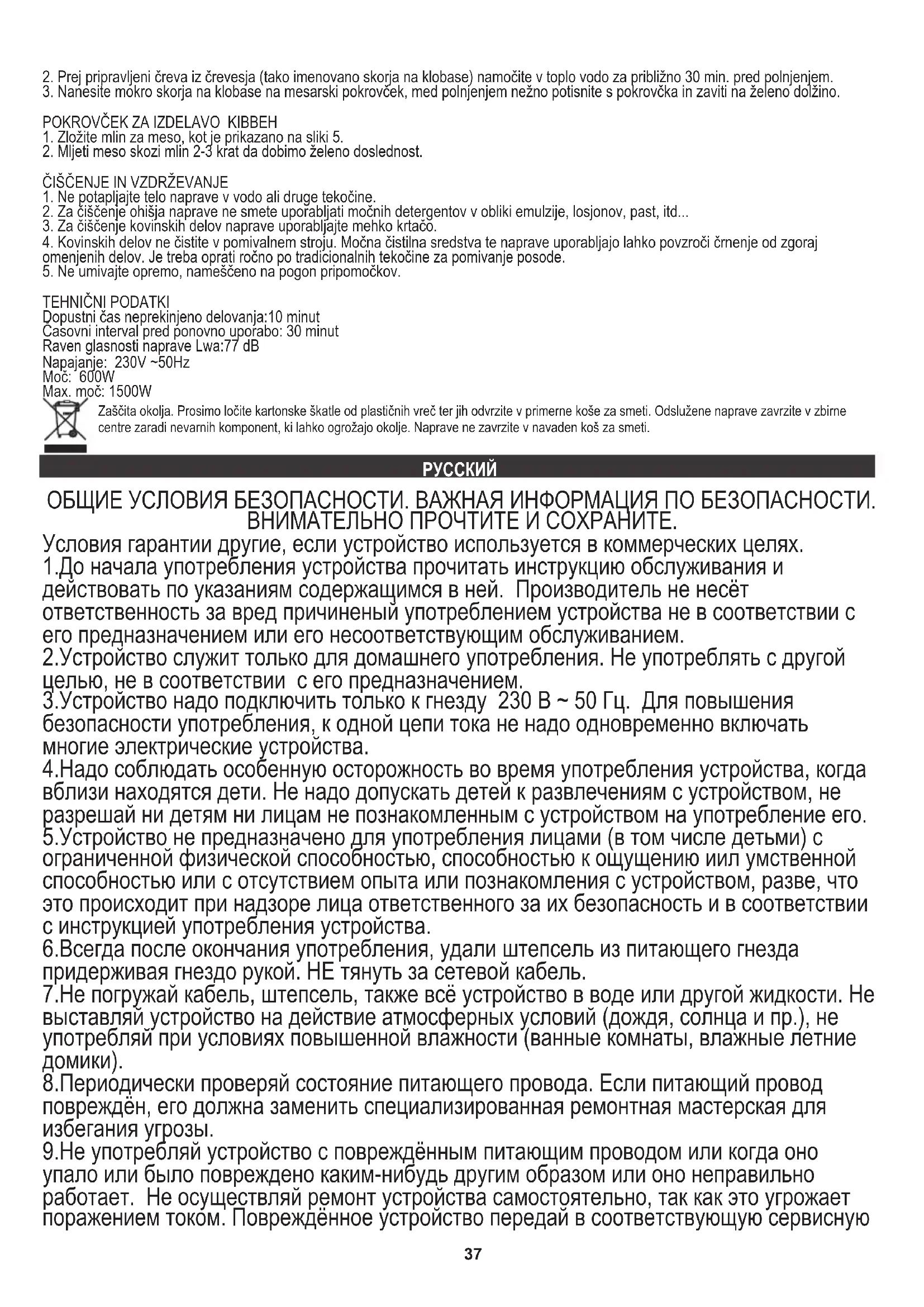 Dopustni čas neprekinjeno delovanja:10 minut Časovni interval pred ponovno uporabo: 30 minut Raven glasnosti naprave Lwa:77 dB Napajanje: 230V ~50Hz Moč: 600W Max. moč: 1500W Zaščita okolja. Prosimo ločite kartonske škatle od plastičnih vreč ter jih odvrzite v primerne koše za smeti. Odslužene naprave zavrzite v zbirne centre zaradi nevarnih komponent, ki lahko ogrožajo okolje. Naprave ne zavrzite v navaden koš za smeti. РУССКИЙ38 точку для проверки или осуществления ремонта. Все ремонты могут осуществлять только сервисные точки, у которых на это право. Неправильно осуществлённый ремонт может спричинить серьёзную угрозу для пользователя. 10.Надо устанавливать устройство на холодной, устойчивой, ровной поверхности, далеко нагревающейся кухонной техники такой как: электрическая плита, газовая горелка и др. 11.Не употреблять устройство вблизи легковоспламеняющихся материалов. 12.Провод питания не может висеть за краем стола или соприкасаться к горячим поверхностям. 13.Не оставляй устройство включеное в гнездо без надзора. 14.Для дополнительной защиты рекомендуется установить в сети устройство защитного отключения (УЗО) с номинальным дифференциальным током не более 30 мА. Для установки, пожалуйста, обратитесь к квалифицированному электрику.