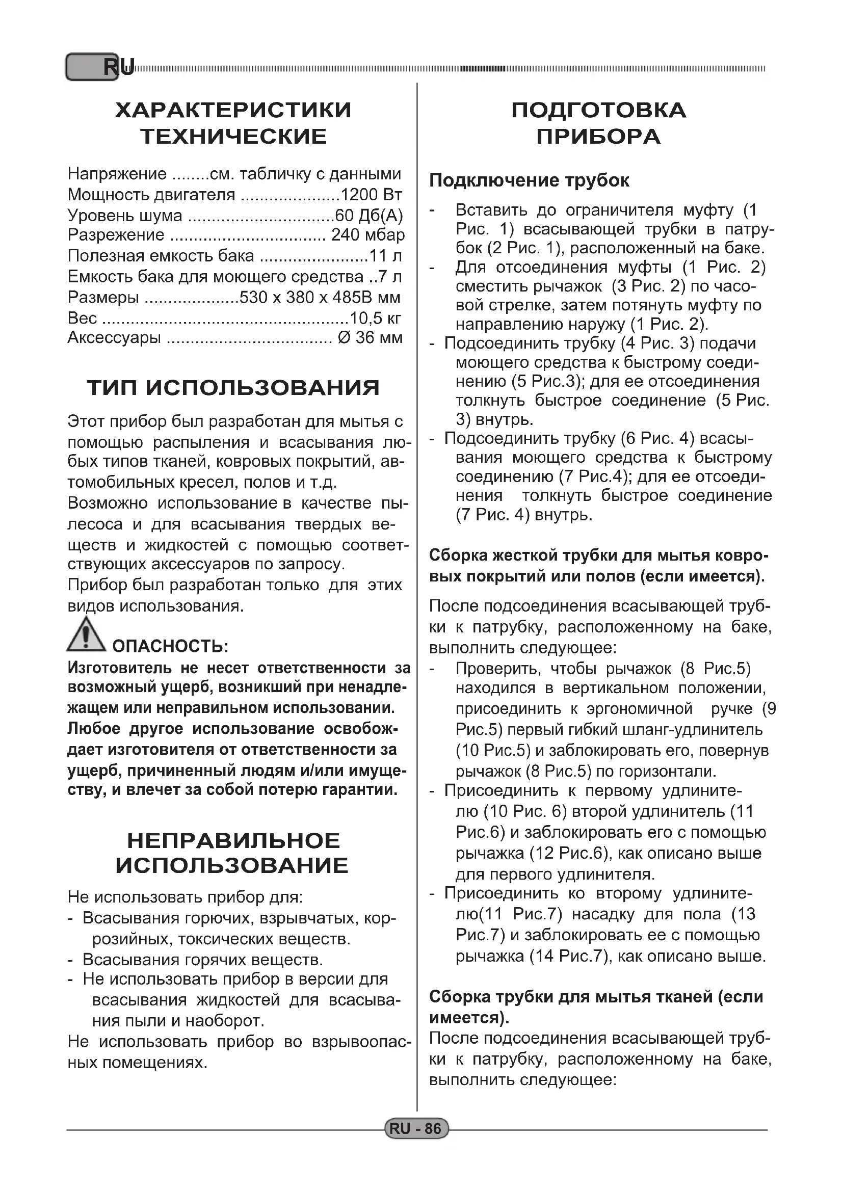 Πατήστε το διακόπτηITRU RU - 86 ХАРАКТЕРИСТИКИ ТЕХНИЧЕСКИЕ Напряжение ........см. табличку с данными Мощность двигателя .....................1200 Вт Уровень шума ...............................60 Дб(A) Разрежение ................................. 240 мбар Полезная емкость бака .......................11 л Емкость бака для моющего средства ..7 л Размеры ....................530 x 380 x 485В мм Вес ....................................................10,5 кг Аксессуары ................................... Ø 36 мм ТИП ИСПОЛЬЗОВАНИЯ Этот прибор был разработан для мытья с помощью распыления и всасывания лю- бых типов тканей, ковровых покрытий, ав- томобильных кресел, полов и т.д. Возможно использование в качестве пы- лесоса и для всасывания твердых ве- ществ и жидкостей с помощью соответ- ствующих аксессуаров по запросу. Прибор был разработан только для этих видов использования.