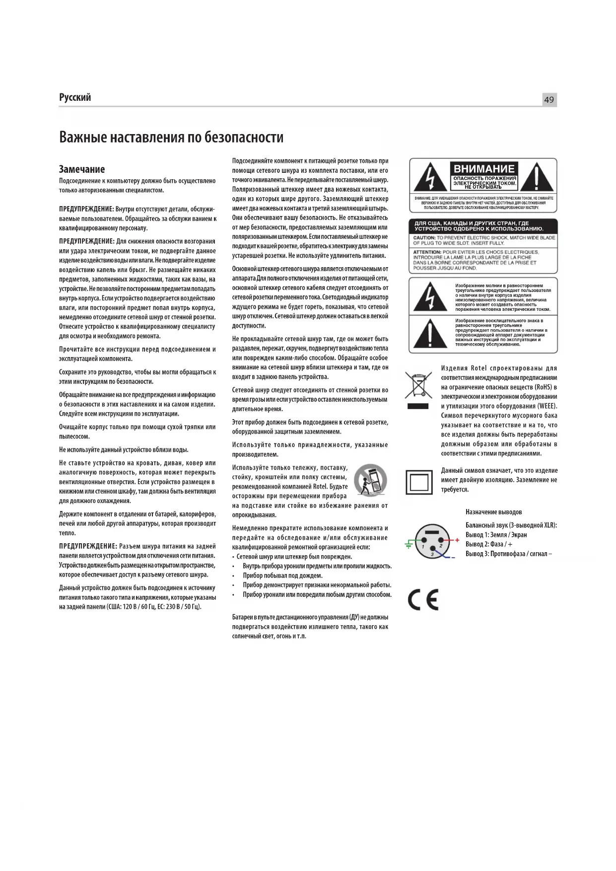 ПРЕДУПРЕЖДЕНИЕ: Разъем шнура питания на задней панели является устройством для отключения сети питания. Устройство должен быть размещен на открытом пространстве, которое обеспечивает доступ к разъему сетевого шнура. Данный устройство должен быть подсоединен к источнику питания только такого типа и напряжения, которые указаны на задней панели (США: 120 В / 60 Гц, ЕС: 230 В / 50 Гц). Изделия Rotel спроектированы для соответствия международным предписаниям на ограничение опасных веществ (RoHS) в электрическом и электронном оборудовании и утилизации этого оборудования (WEEE). Символ перечеркнутого мусорного бака указывает на соответствие и на то, что все изделия должны быть переработаны должным образом или обработаны в соответствии с этими предписаниями. Важные наставления по безопасности Подсоединяйте компонент к питающей розетке только при помощи сетевого шнура из комплекта поставки, или его точного эквивалента. Не переделывайте поставляемый шнур. Поляризованный штеккер имеет два ножевых контакта, один из которых шире другого. Заземляющий штеккер имеет два ножевых контакта и третий заземляющий штырь. Они обеспечивают вашу безопасность. Не отказывайтесь от мер безопасности, предоставляемых заземляющим или поляризованным штеккером. Если поставляемый штеккер не подходит к вашей розетке, обратитесь к электрику для замены устаревшей розетки. Не используйте удлинитель питания. Основной штеккер сетевого шнура является отключаемым от аппарата Для полного отключения изделия от питающей сети, основной штеккер сетевого кабеля следует отсоединять от сетевой розетки переменного тока. Светодиодный индикатор ждущего режима не будет гореть, показывая, что сетевой шнур отключен. Сетевой штекер должен оставаться в легкой доступности. Не прокладывайте сетевой шнур там, где он может быть раздавлен, пережат, скручен, подвергнут воздействию тепла или поврежден каким-либо способом. Обращайте особое внимание на сетевой шнур вблизи штеккера и там, где он входит в заднюю панель устройства. Сетевой шнур следует отсоединять от стенной розетки во время грозы или если устройство оставлен неиспользуемым длительное время. Этот прибор должен быть подсоединен к сетевой розетке, оборудованной защитным заземлением. Используйте только принадлежности, указанные производителем. Используйте только тележку, поставку, стойку, кронштейн или полку системы, рекомендованной компанией Rotel. Будьте осторожны при перемещении прибора на подставке или стойке во избежание ранения от опрокидывания. Немедленно прекратите использование компонента и передайте на обследование и/или обслуживание квалифицированной ремонтной организацией если: