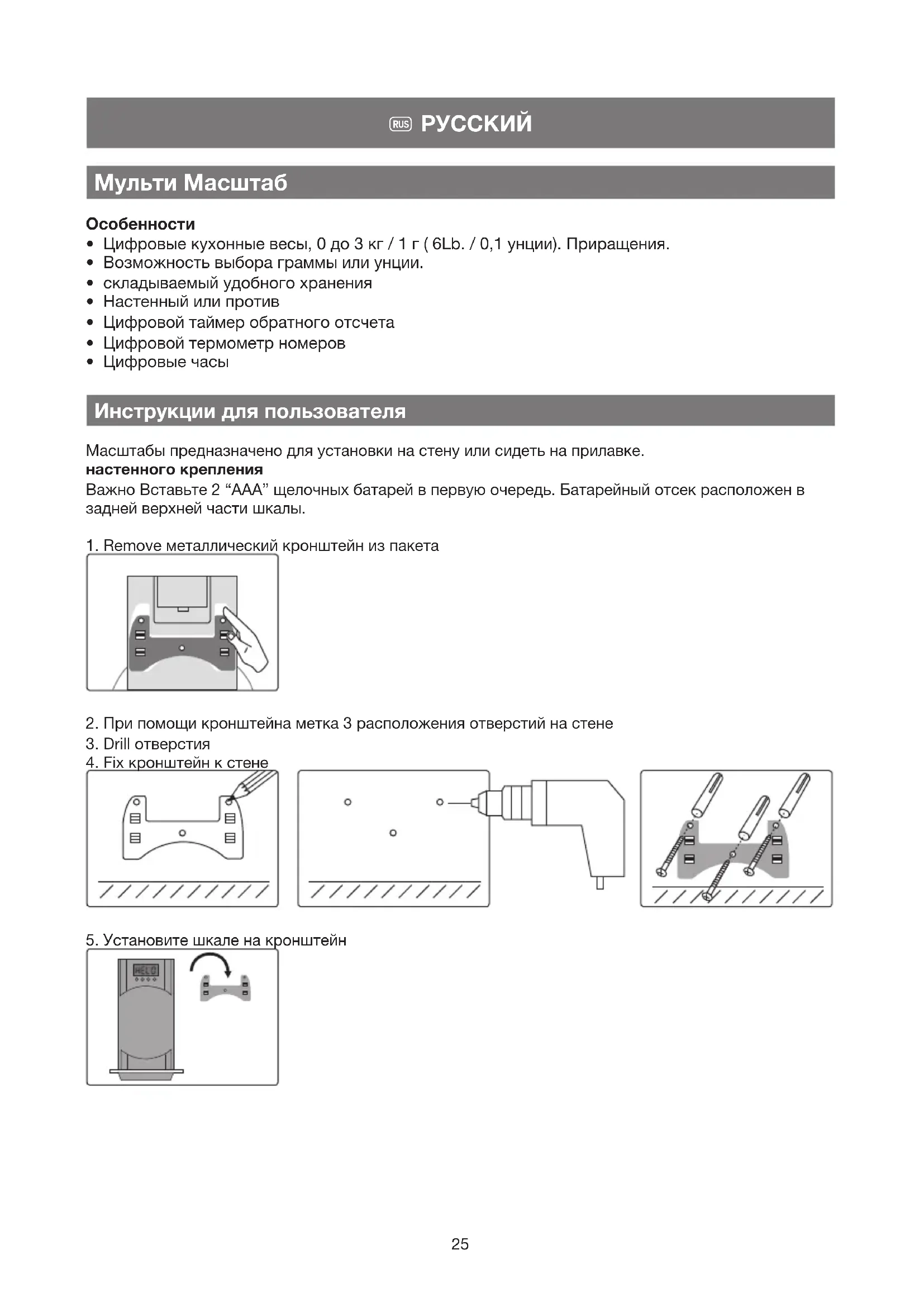 - Цифровые часы Инструкции для пользователя Масштабы предназначено для установки на стену или сидеть на прилавке. настенного крепления Важно Вставьте 2 “AAA” щелочных батарей в первую очередь. Батарейный отсек расположен в задней верхней части шкалы.
