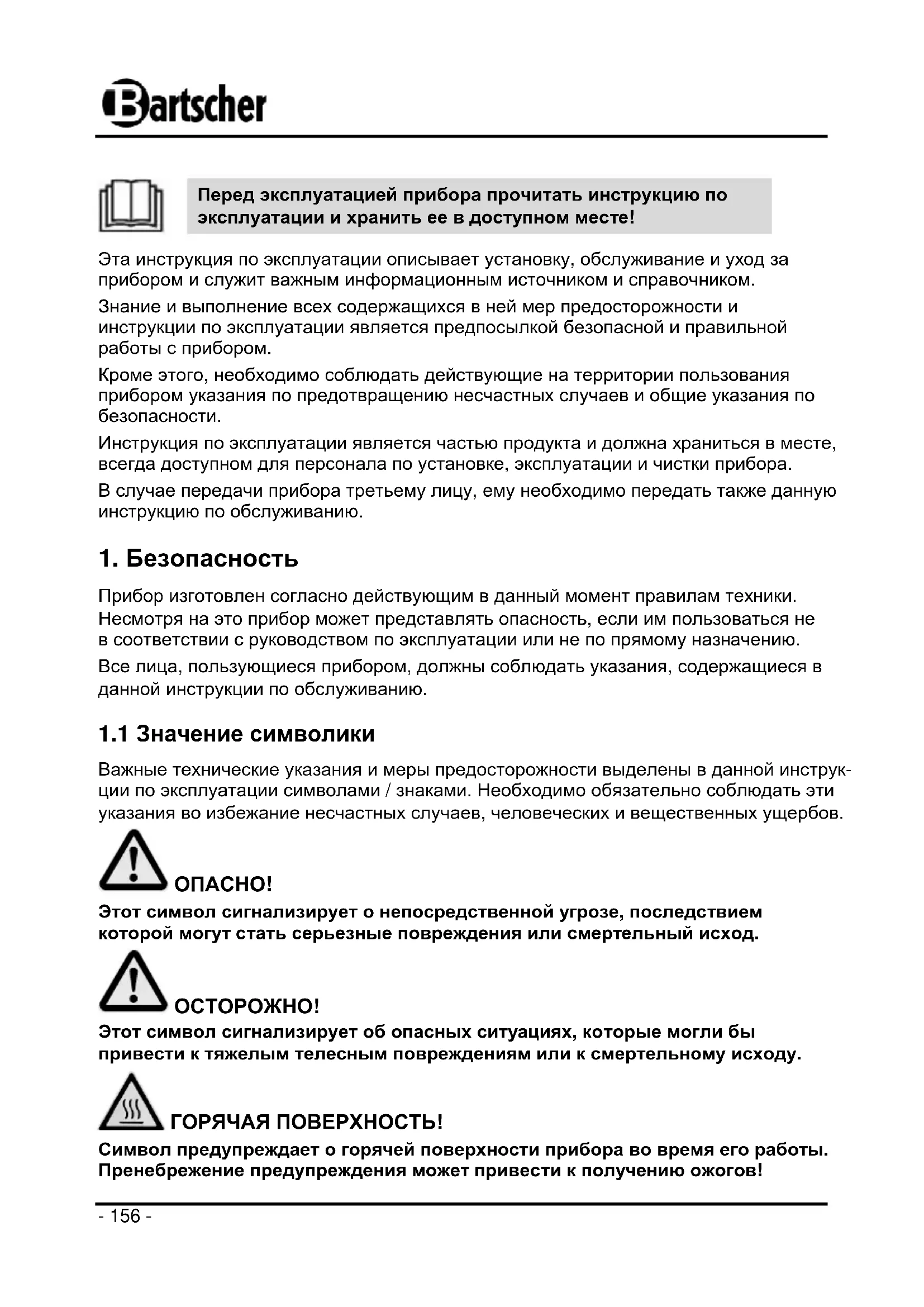 Этот символ сигнализирует об опасных ситуациях, которые могли бы привести к тяжелым телесным повреждениям или к смертельному исходу. ГОРЯЧАЯ ПОВЕРХНОСТЬ! Символ предупреждает о горячей поверхности прибора во время его работы. Пренебрежение предупреждения может привести к получению ожогов!- 157 -