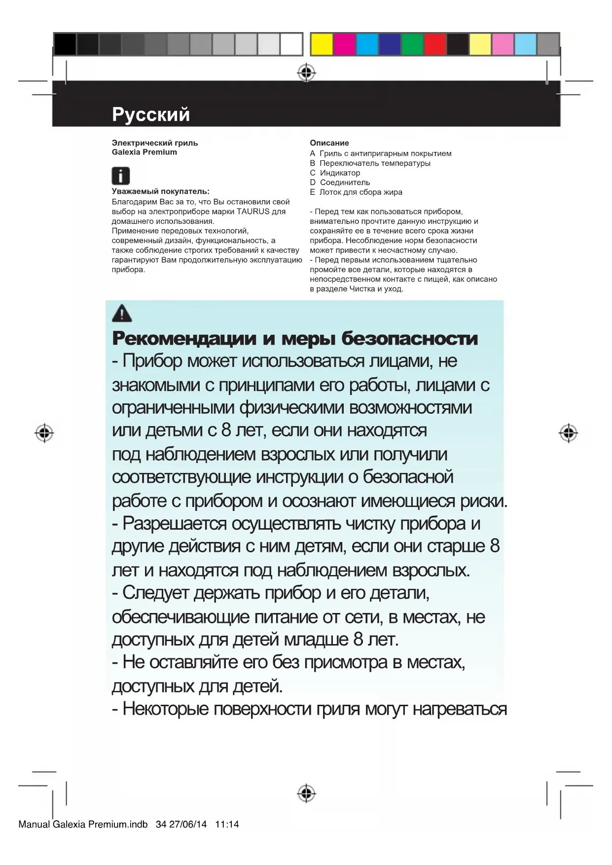 Manual Galexia Premium.indb 33 27/06/14 11:14Русски Электрически гриль Galexia Premium Уважаемы покупатель: Благодарим Вас за то, что Вы остановили свой выбор на электроприборе марки TAURUS для домашнего использования. Применение передовых технологий, современный дизайн, функциональность, а также соблюдение строгих требований к качеству гарантируют Вам продолжительную эксплуатацию