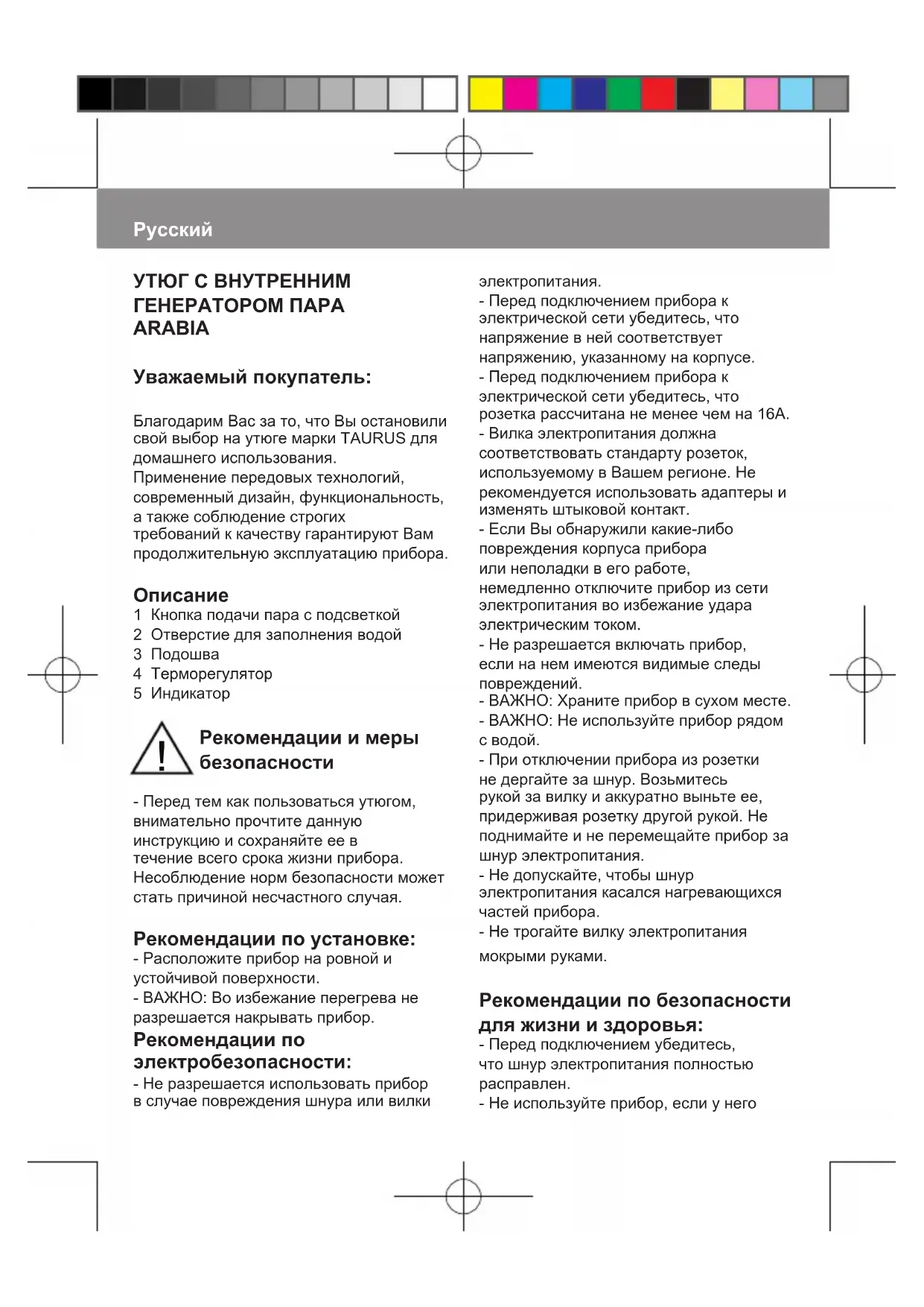 - При отключении прибора из розетки не дергайте за шнур. Возьмитесь рукой за вилку и аккуратно выньте ее, придерживая розетку другой рукой. Не поднимайте и не перемещайте прибор за шнур электропитания. - Не допускайте, чтобы шнур электропитания касался нагревающихся частей прибора. - Не трогайте вилку электропитания мокрыми руками. Рекомендации по безопасности для жизни и здоровья: - Перед подключением убедитесь, что шнур электропитания полностью расправлен. - Не используйте прибор, если у него УТЮГ С ВНУТРЕННИМ ГЕНЕРАТОРОМ ПАРА ARABIA Уважаемый покупатель: Благодарим Вас за то, что Вы остановили свой выбор на утюге марки TAURUS для домашнего использования. Применение передовых технологий, современный дизайн, функциональность, а также соблюдение строгих требований к качеству гарантируют Вам продолжительную эксплуатацию прибора.