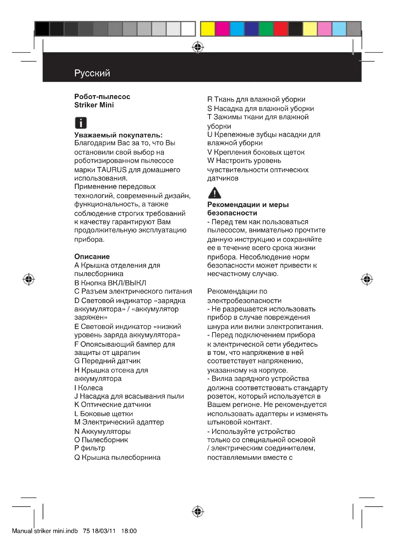 Рекомендации и меры безопасности - Перед тем как пользоваться пылесосом, внимательно прочтите данную инструкцию и сохраняйте ее в течение всего срока жизни прибора. Несоблюдение норм безопасности может привести к несчастному случаю. Рекомендации по электробезопасности - Не разрешается использовать прибор в случае повреждения шнура или вилки электропитания. - Перед подключением прибора к электрической сети убедитесь в том, что напряжение в ней соответствует напряжению, указанному на корпусе. - Вилка зарядного устройства должна соответствовать стандарту розеток, который используется в Вашем регионе. Не рекомендуется использовать адаптеры и изменять штыковой контакт. - Используйте устройство только со специальной основой / электрическим соединителем, поставляемыми вместе с Manual striker mini.indb 75 18/03/11 18:00прибором. - Не используйте и не храните прибор на улице. - Не используйте прибор рядом с ванной, душем или бассейном. - При выключении прибора из розетки не дергайте за шнур. Возьмитесь рукой за вилку и аккуратно выньте ее, придерживая розетку другой рукой. Не поднимайте и не перемещайте прибор за шнур электропитания. - Не трогайте вилку электропитания мокрыми руками. Рекомендации по личной безопасности - Избегайте контакта с жидкостью, которая может пролиться из аккумулятора. При попадании в глаза немедленно промойте их водой и обратитесь к врачу. Аккумуляторная жидкость вызвает раздражение и ожоги. Рекомендации по безопасности для жизни и здоровья - Перед подключением убедитесь в том, что шнур электропитания полностью расправлен. - Не используйте прибор, если его аксессуары или расходные материалы не присоединены должным образом. - Не используйте прибор, если у него неисправна кнопка ВКЛ/