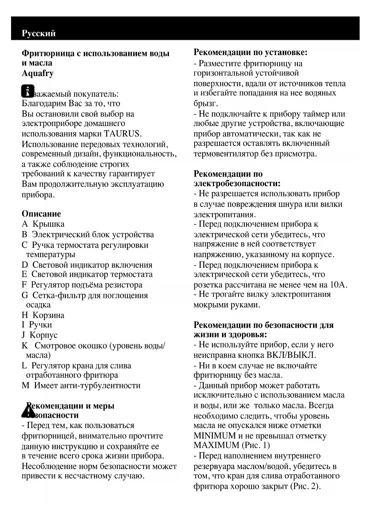 Aquafry Уважаемый покупатель: Благодарим Вас за то, что Вы остановили свой выбор на электроприборе домашнего использования марки TAURUS. Использование передовых технологий, современный дизайн, функциональность, а также соблюдение строгих требований к качеству гарантирует Вам продолжительную эксплуатацию