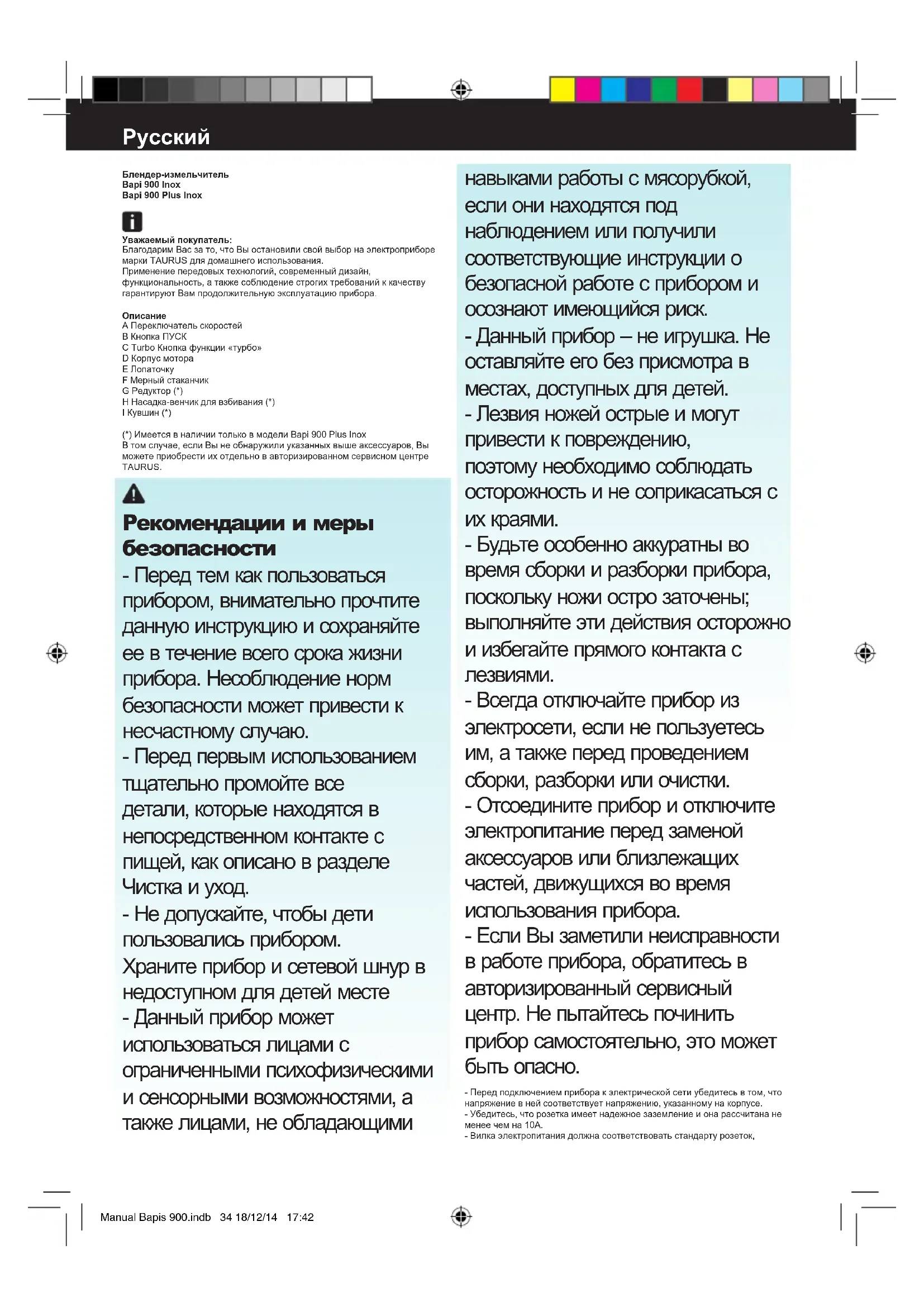 A Переключатель скоростей B Кнопка ПУСК C Turbo Кнопка функции «турбо» D Корпус мотора E Лопаточку F Мерный стаканчик G Редуктор (*) H Насадка-венчик для взбивания (*) I Кувшин (*) (*) Имеется в наличии только в модели Bapi 900 Plus Inox В том случае, если Вы не обнаружили указанных выше аксессуаров, Вы можете приобрести их отдельно в авторизированном сервисном центре TAURUS. Рекомендации и меры безопасности - Перед тем как пользоваться прибором, внимательно прочтите данную инструкцию и сохраняйте ее в течение всего срока жизни прибора. Несоблюдение норм безопасности может привести к несчастному случаю. - Перед первым использованием тщательно промойте все детали, которые находятся в непосредственном контакте с пищей, как описано в разделе Чистка и уход. - Не допускайте, чтобы дети пользовались прибором. Храните прибор и сетевой шнур в недоступном для детей месте - Данный прибор может использоваться лицами с ограниченными психофизическими и сенсорными возможностями, а также лицами, не обладающими навыками работы с мясорубкой, если они находятся под наблюдением или получили соответствующие инструкции о безопасной работе с прибором и осознают имеющийся риск. - Данный прибор – не игрушка. Не оставляйте его без присмотра в местах, доступных для детей. - Лезвия ножей острые и могут привести к повреждению, поэтому необходимо соблюдать осторожность и не соприкасаться с