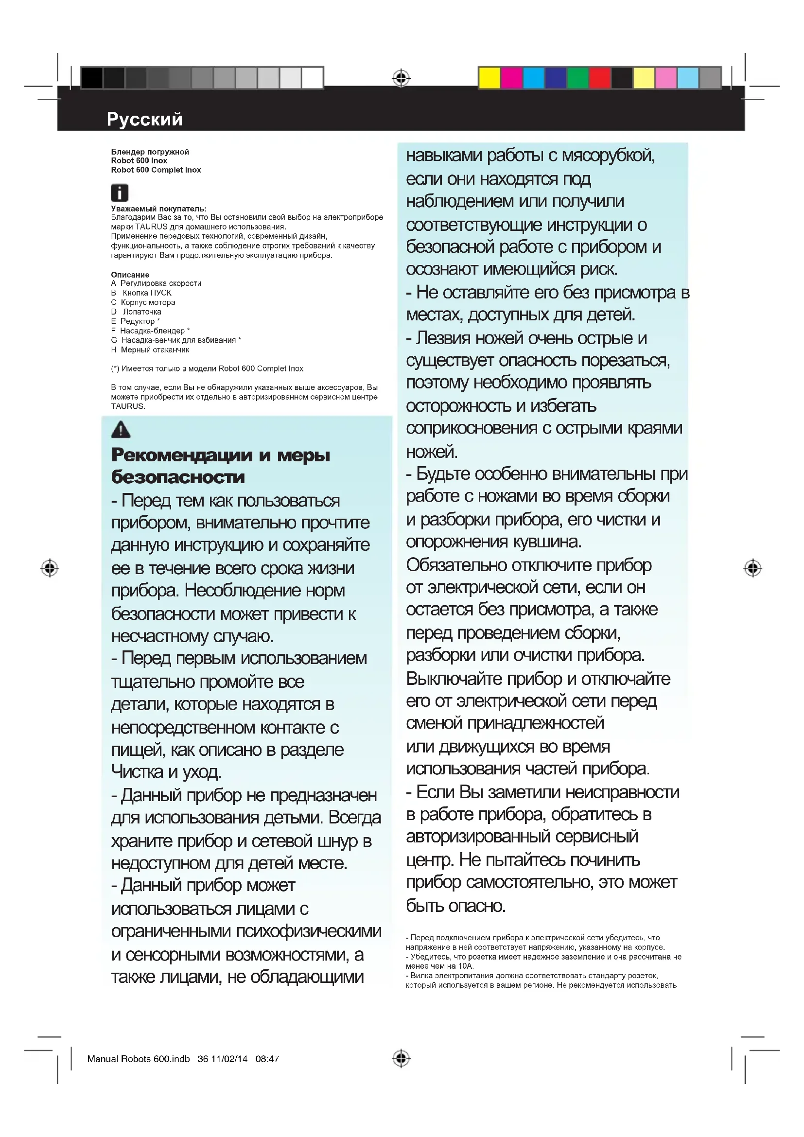 РУКОВОДСТВО ПОЛЬЗОВАТЕЛЯ Robot 600 Complet Inox TAURUS