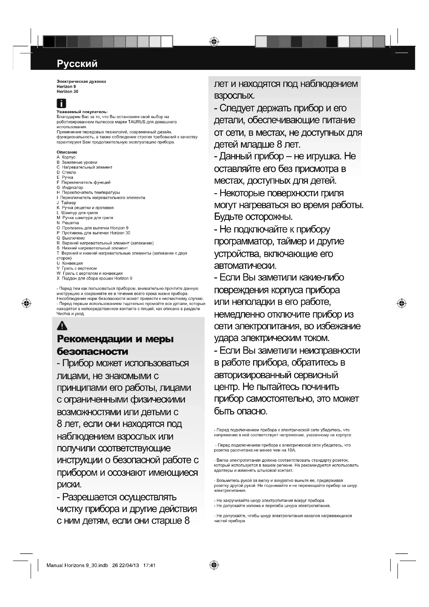 - Следует держать прибор и его детали, обеспечивающие питание от сети, в местах, не доступных для детей младше 8 лет. - Данный прибор – не игрушка. Не оставляйте его без присмотра в местах, доступных для детей. - Некоторые поверхности гриля могут нагреваться во время работы. Будьте осторожны. - Не подключайте к прибору программатор, таймер и другие устройства, включающие его автоматически. - Если Вы заметили какие-либо повреждения корпуса прибора или неполадки в его работе, немедленно отключите прибор из сети электропитания, во избежание удара электрическим током. - Если Вы заметили неисправности в работе прибора, обратитесь в авторизированный сервисный центр. Не пытайтесь починить прибор самостоятельно, это может быть опасно. - Перед подключением прибора к электрической сети убедитесь, что напряжение в ней соответствует напряжению, указанному на корпусе. - Перед подключением прибора к электрической сети убедитесь, что розетка рассчитана не менее чем на 10А. - Вилка электропитания должна соответствовать стандарту розеток, который используется в вашем регионе. Не рекомендуется использовать адаптеры и изменять штыковой контакт. - Возьмитесь рукой за вилку и аккуратно выньте ее, придерживая розетку другой рукой. Не поднимайте и не перемещайте прибор за шнур электропитания. - Не закручивайте шнур электропитания вокруг прибора. - Не допускайте излома и перегиба шнура электропитания. - Не допускайте, чтобы шнур электропитания касался нагревающихся частей прибора. Manual Horizons 9_30.indb 26 22/04/13 17:41- Проверьте состояние шнура электропитания. Поврежденные или запутанные шнуры повышают риск удара электрическим током. - Не трогайте вилку электропитания мокрыми руками. - Не разрешается использовать прибор в случае повреждения шнура или вилки электропитания. - Данный прибор не предназначен для использования вне дома. - Расположите прибор на ровной и устойчивой поверхности. - Не устанавливайте прибор вблизи легко воспламеняющихся предметов (ткань, картон, бумага и пр.…) - ВАЖНО: Во избежание перегрева, не разрешается накрывать прибор. - Следите за тем, чтобы отверстия для входа и выхода воздуха не оказывались полностью или частично закрытыми мебелью, шторами, одеждой и т.д.: в данных случаях существует риск возникновения пожара. - Не используйте и не храните прибор на улице. Рекомендации по безопасности для жизни и здоровья: - Перед подключением убедитесь, что шнур электропитания полностью расправлен. - Не используйте прибор с неисправным таймером (J). - Используйте ручку/и для транспортировки и перемещения прибора. - Отключите прибор из розетки. Дождитесь, пока она полностью остынет перед тем, как приступать к чистке. - Данный прибор предназначен исключительно для домашнего использования. Не разрешается использовать прибор в промышленных или коммерческих целях. - Храните прибор в местах, недоступных для детей и / или недееспособных лиц. - Не храните прибор в вертикальном положении. - Перед тем, как убрать прибор на хранение, необходимо дать ему остыть. - Поддерживайте чистоту во внутреннем пространстве духовки: остатки продуктов могут обуглиться и повредить прибор. - Не используйте прибор для стрижки домашних животных. - Не используйте прибор для сушки тканей. - Не используйте внутреннее пространство духовки для хранения