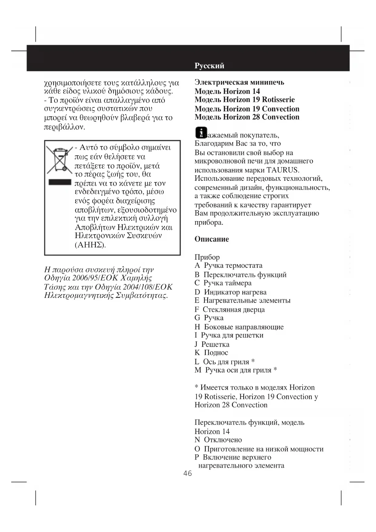 U Приготовление на низкой мощности с функцией Rotisserie V Включение верхнего нагревательного элемента с функцией Rotisserie W Приготовление на высокой мощности с функцией Rotisserie Переключатель функций, модель Horizon 19 Convection и Horizon 28 Convection X Отключено Y Приготовление на высокой мощности с функцией конвекции Z Включение верхнего нагревательного элемента с функцией конвекции AA Приготовление на высокой мощности без функции конвекции AB Включение верхнего нагревательного элемента с функцией Rotisserie AC Приготовление на высокой мощности с функцией конвекции и Rotisserie Рекомендацииимеры безопасности - Перед тем, как пользоваться печью, внимательно прочтите данную инструкцию и сохраняйте ее в течение всего срока жизни прибора. Несоблюдение норм безопасности и рекомендаций настоящей инструкции может привести к несчастному случаю. 46 47Электрическаяминипечь МодельHorizon14 МодельHorizon19Rotisserie МодельHorizon19Convection МодельHorizon28Convection Уважаемый покупатель, Благодарим Вас за то, что Вы остановили свой выбор на микроволновой печи для домашнего использования марки TAURUS. Использование передовых технологий, современный дизайн, функциональность, а также соблюдение строгих требований к качеству гарантирует Вам продолжительную эксплуатацию
