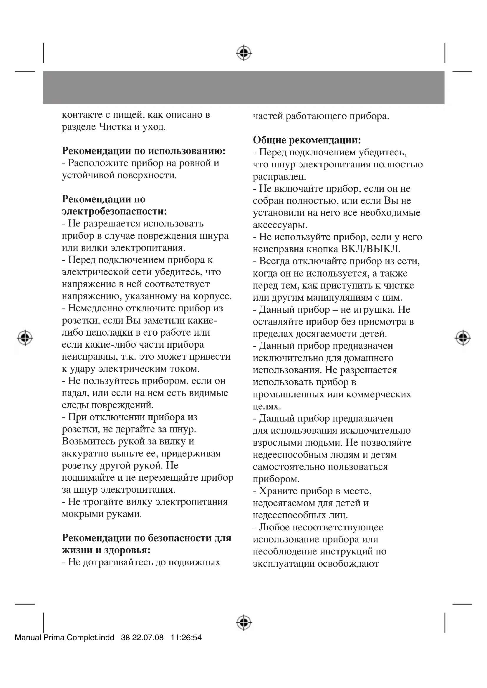 A Скоростной переключатель B Кнопка высвобождения аксессуаров C Вращающая чаша D Моторный корпус E Взбивающие венчики F Насадки для замешивания теста Рекомендации и меры безопасности - Перед тем, как пользоваться прибором, внимательно прочтите данную инструкцию и сохраняйте ее в течение всего срока жизни прибора. Несоблюдение норм безопасности и рекомендаций данной инструкции может привести к несчастному случаю. - Перед первым использованием тщательно промойте все детали прибора, которые находятся в Manual Prima Complet.indd 37 22.07.08 11:26:54контакте с пищей, как описано в разделе Чистка и уход. Рекомендации по использованию: - Расположите прибор на ровной и устойчивой поверхности. Рекомендации по электробезопасности: - Не разрешается использовать прибор в случае повреждения шнура или вилки электропитания. - Перед подключением прибора к электрической сети убедитесь, что напряжение в ней соответствует напряжению, указанному на корпусе. - Немедленно отключите прибор из розетки, если Вы заметили какие- либо неполадки в его работе или если какие-либо части прибора неисправны, т.к. это может привести к удару электрическим током. - Не пользуйтесь прибором, если он падал, или если на нем есть видимые следы повреждений. - При отключении прибора из розетки, не дергайте за шнур. Возьмитесь рукой за вилку и аккуратно выньте ее, придерживая розетку другой рукой. Не поднимайте и не перемещайте прибор за шнур электропитания. - Не трогайте вилку электропитания мокрыми руками. Рекомендации по безопасности для жизни и здоровья: - Не дотрагивайтесь до подвижных частей работающего прибора. Общие рекомендации: - Перед подключением убедитесь, что шнур электропитания полностью расправлен. - Не включайте прибор, если он не собран полностью, или если Вы не установили на него все необходимые аксессуары. - Не используйте прибор, если у него неисправна кнопка ВКЛ/ВЫКЛ. - Всегда отключайте прибор из сети, когда он не используется, а также перед тем, как приступить к чистке или другим манипуляциям с ним. - Данный прибор – не игрушка. Не оставляйте прибор без присмотра в пределах досягаемости детей. - Данный прибор предназначен исключительно для домашнего использования. Не разрешается использовать прибор в промышленных или коммерческих