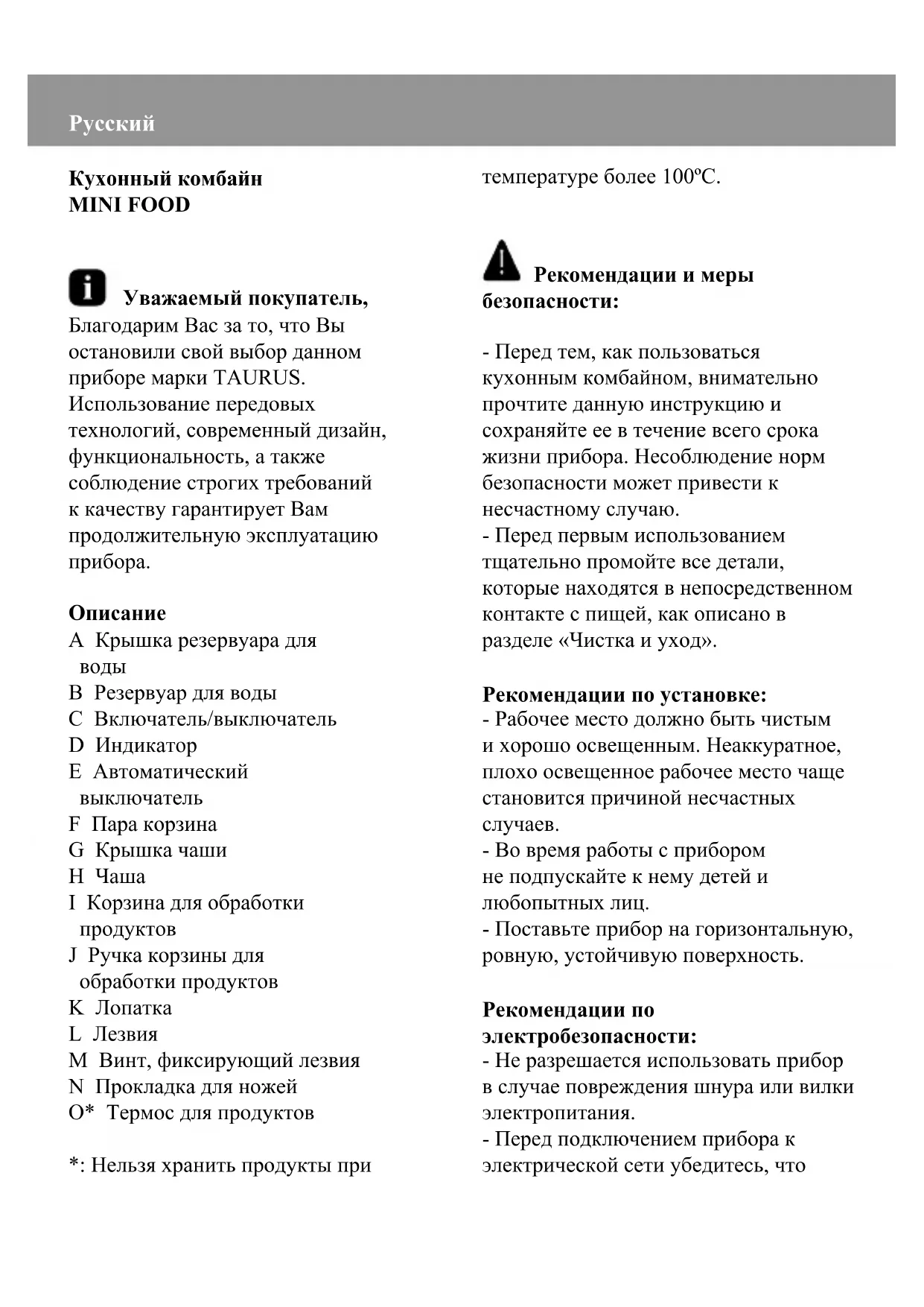 РУКОВОДСТВО ПОЛЬЗОВАТЕЛЯ Mini Food TAURUS