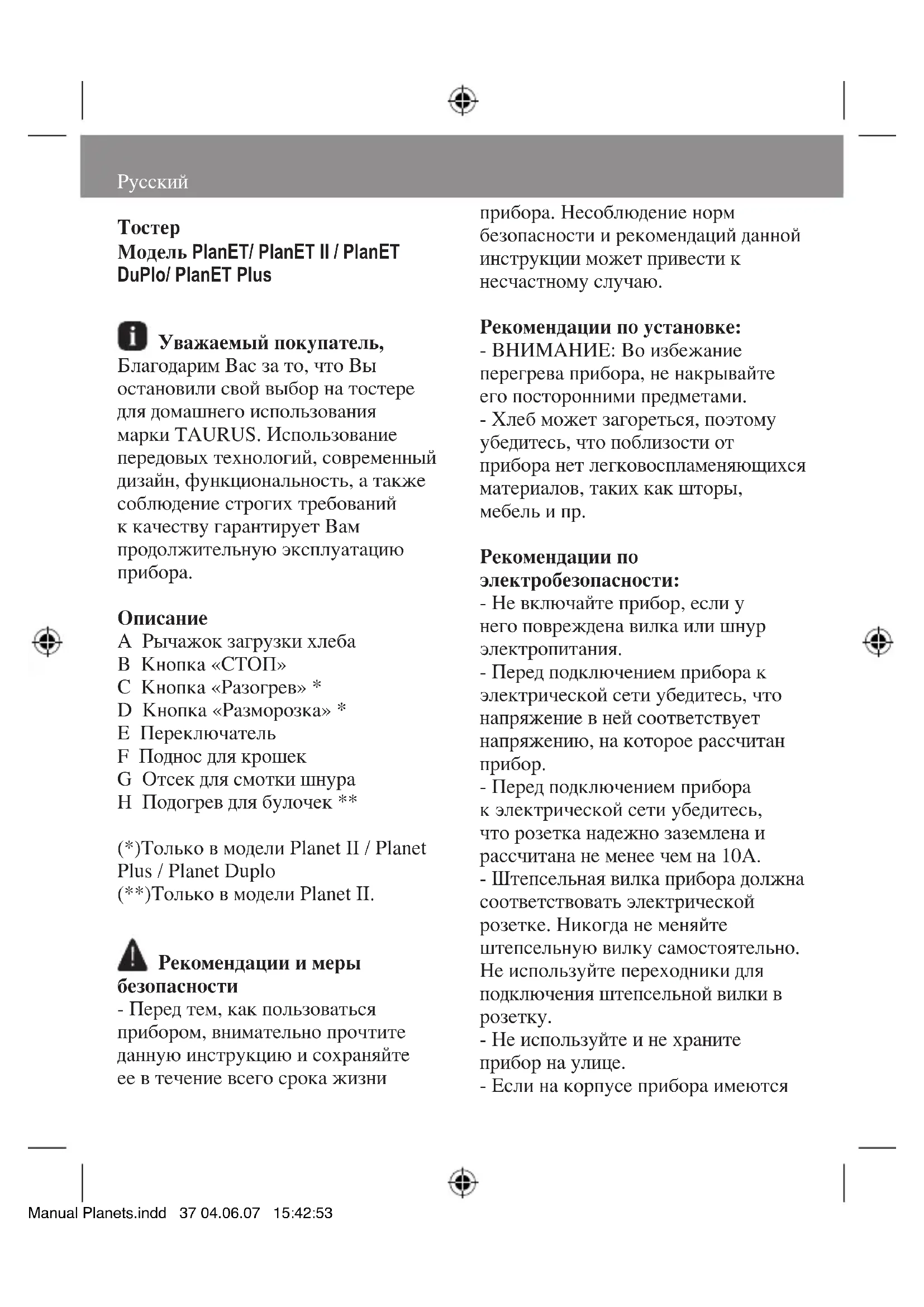 А Рычажок загрузки хлеба В Кнопка «СТОП» С Кнопка «Разогрев» * D Кнопка «Разморозка» * Е Переключатель F Поднос для крошек G Отсек для смотки шнура H Подогрев для булочек ** (*)Только в модели Planet II / Planet Plus / Planet Duplo (**)Только в модели Planet II. Рекомендации и меры безопасности - Перед тем, как пользоваться прибором, внимательно прочтите данную инструкцию и сохраняйте ее в течение всего срока жизни прибора. Несоблюдение норм безопасности и рекомендаций данной инструкции может привести к несчастному случаю. Рекомендации по установке: - ВНИМАНИЕ: Во избежание перегрева прибора, не накрывайте его посторонними предметами. - Хлеб может загореться, поэтому убедитесь, что поблизости от прибора нет легковоспламеняющихся материалов, таких как шторы, мебель и пр. Рекомендации по электробезопасности: - Не включайте прибор, если у него повреждена вилка или шнур электропитания. - Перед подключением прибора к электрической сети убедитесь, что напряжение в ней соответствует напряжению, на которое рассчитан