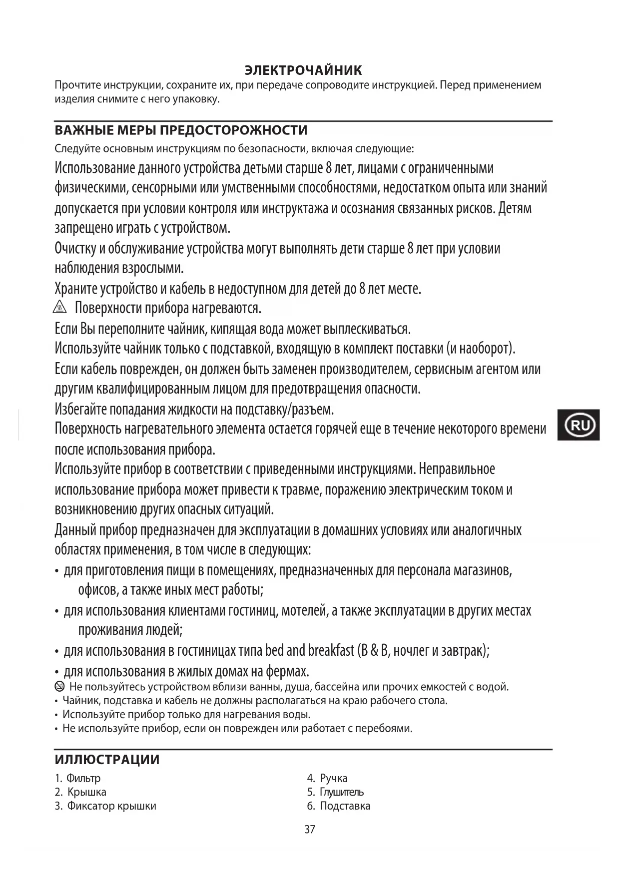 Jotta vältettäisiin vaarallisista aineista ympäristölle ja terveydelle koituvat haitat, näillä symboleilla varustettuja laitteita sekä ladattavia ja kertakäyttöisiä paristoja ei saa hävittää lajittelemattomana sekajätteenä. Hävitä sähkö- ja elektroniikkatuotteet sekä, mikäli sovellettavissa, ladattavat ja kertakäyttöiset paristot asianmukaiseen viralliseen kierrätys-/keräilypisteeseen.37 ЭЛЕКТРОЧАЙНИК Прочтите инструкции, сохраните их, при передаче сопроводите инструкцией. Перед применением изделия снимите с него упаковку. ВАЖНЫЕ МЕРЫ ПРЕДОСТОРОЖНОСТИ Следуйте основным инструкциям по безопасности, включая следующие: Использование данного устройства детьми старше 8 лет, лицами с ограниченными физическими, сенсорными или умственными способностями, недостатком опыта или знаний допускается при условии контроля или инструктажа и осознания связанных рисков. Детям запрещено играть с устройством. Очистку и обслуживание устройства могут выполнять дети старше 8 лет при условии наблюдения взрослыми. Храните устройство и кабель в недоступном для детей до 8 лет месте. h Поверхности прибора нагреваются. Если Вы переполните чайник, кипящая вода может выплескиваться. Используйте чайник только с подставкой, входящую в комплект поставки (и наоборот). Если кабель поврежден, он должен быть заменен производителем, сервисным агентом или другим квалифицированным лицом для предотвращения опасности. Избегайте попадания жидкости на подставку/разъем. Поверхность нагревательного элемента остается горячей еще в течение некоторого времени после использования прибора. Используйте прибор в соответствии с приведенными инструкциями. Неправильное использование прибора может привести к травме, поражению электрическим током и возникновению других опасных ситуаций. Данный прибор предназначен для эксплуатации в домашних условиях или аналогичных областях применения, в том числе в следующих: