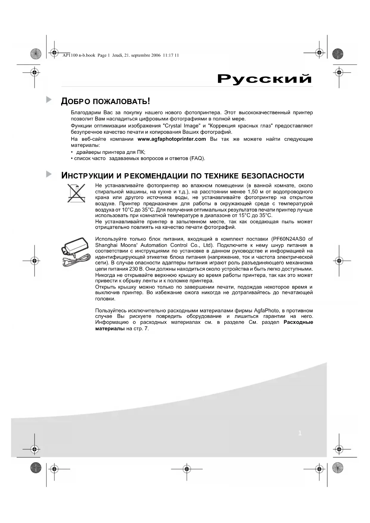 ДОБРО ПОЖАЛОВАТЬ! Благодарим Вас за покупку нашего нового фотопринтера. Этот высококачественный принтер позволит Вам насладиться цифровыми фотографиями в полной мере. Функции оптимизации изображения "Crystal Image" и "Коррекция красных глаз" предоставляют безупречное качество печати и копирования Ваших фотографий. На веб-сайте компании www.agfaphotoprinter.com Вы так же можете найти следующие