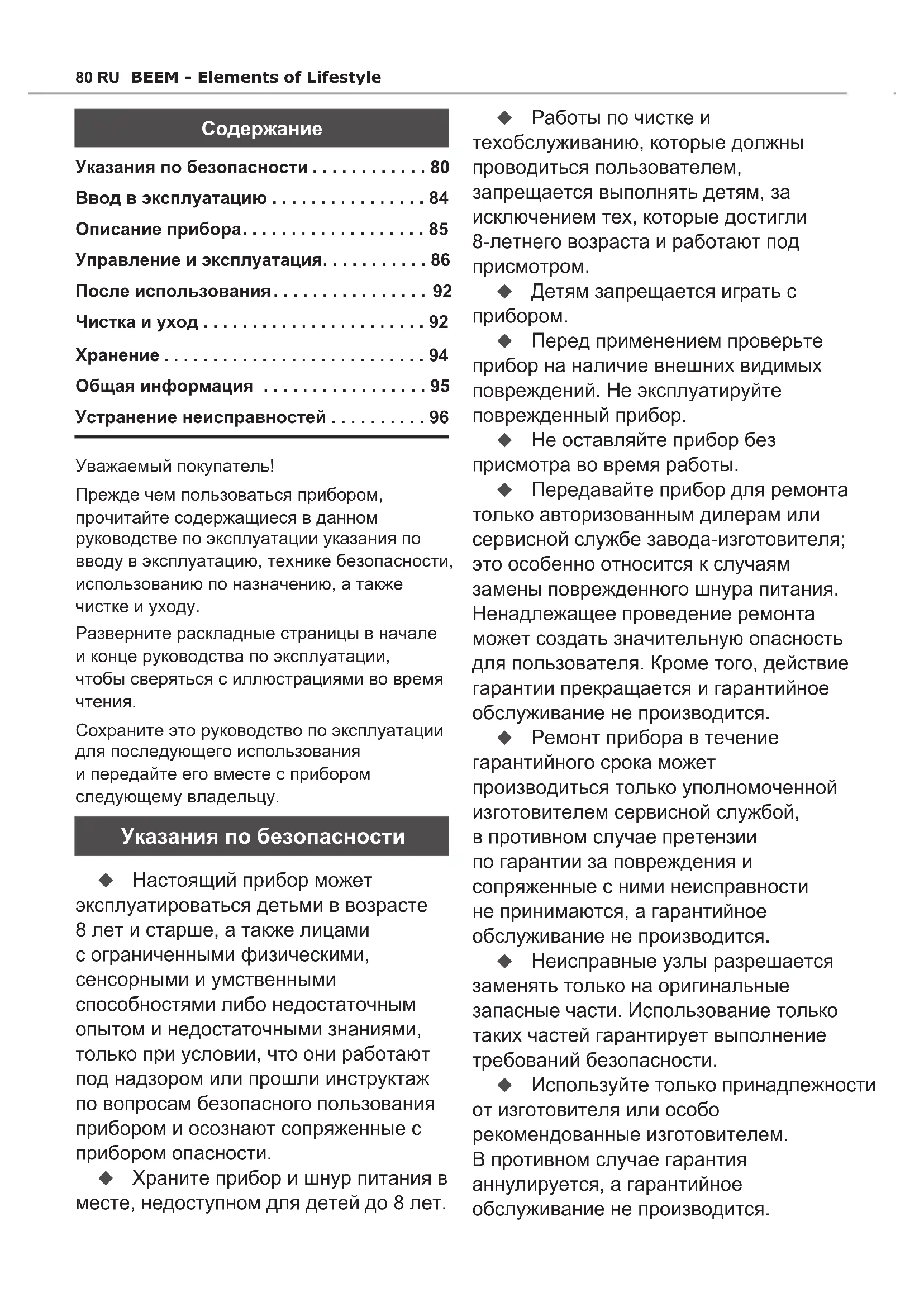 - Устранение неисправностей СодержаниеBEEM - Elements of Lifestyle RU 81 ► Выньте вилку из розетки – при заправке бака водой, – на время перерыва в пользовании прибором, – в случае выявления неисправности при эксплуатации p. 96