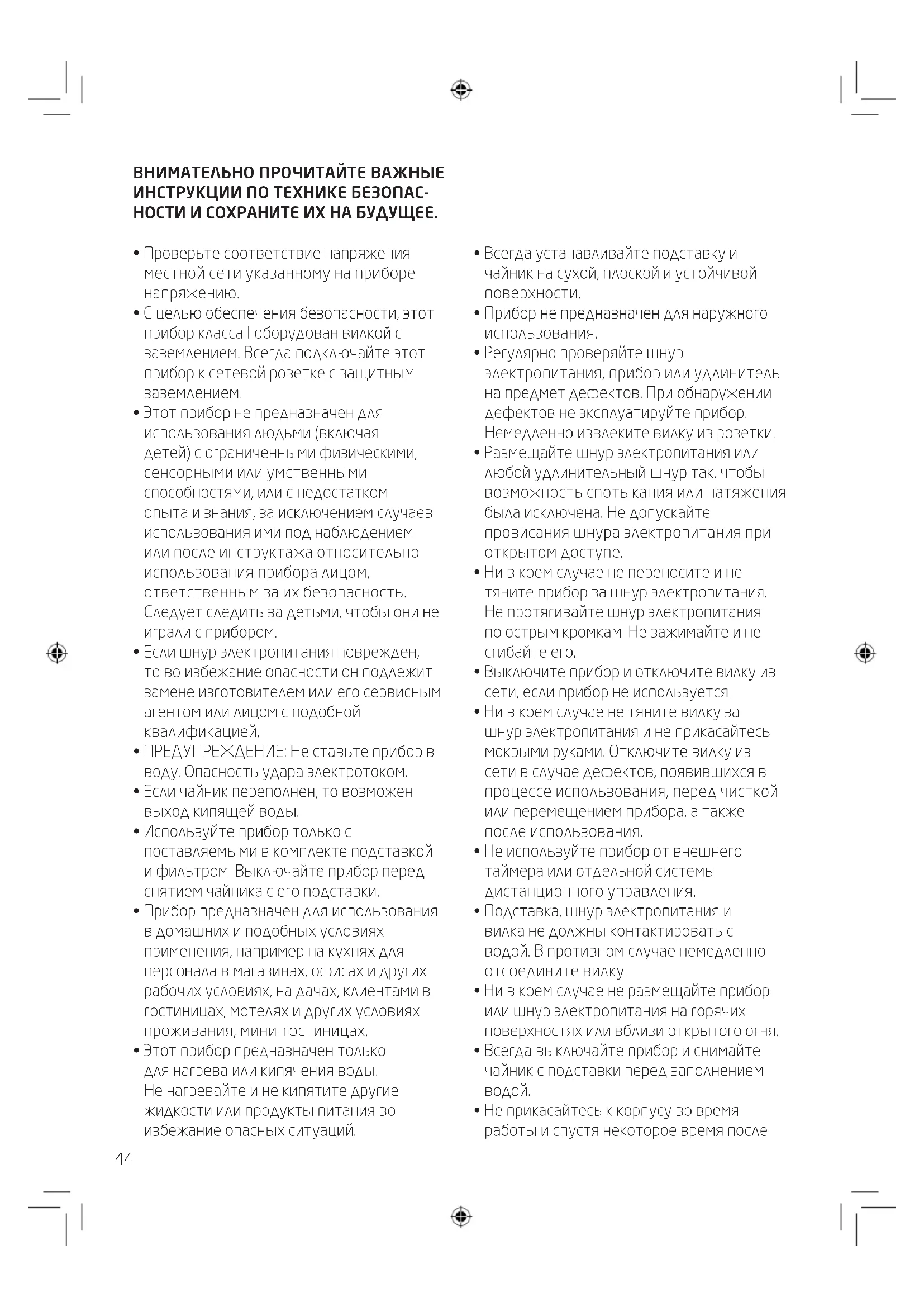 - Этот прибор предназначен только для нагрева или кипячения воды. Не нагревайте и не кипятите другие жидкости или продукты питания во избежание опасных ситуаций.
