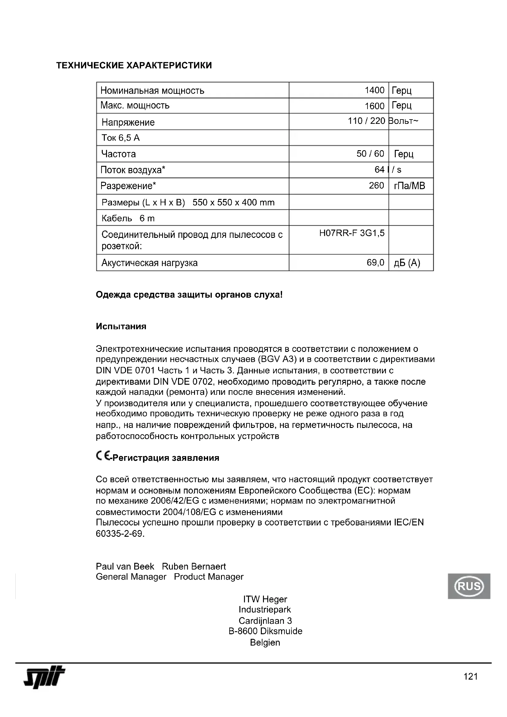 Со всей ответственностью мы заявляем, что настоящий продукт соответствует нормам и основным положениям Европейского Сообщества (ЕС): нормам по механике 2006/42/EG с изменениями; нормам по электромагнитной совместимости 2004/108/EG с изменениями Пылесосы успешно прошли проверку в соответствии с требованиями IEC/EN 60335-2-69.