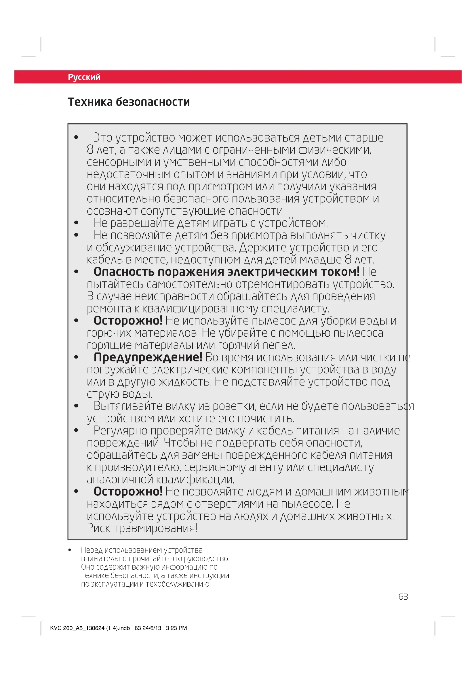 - Передиспользованиемустройства внимательнопрочитайтеэторуководство. Оносодержитважнуюинформациюпо техникебезопасности,атакжеинструкции поэксплуатацииитехобслуживанию. KVC 200_A5_130624 (1.4).indb 63 24/6/13 3:23 PM64 Русский Русский Техника безопасности