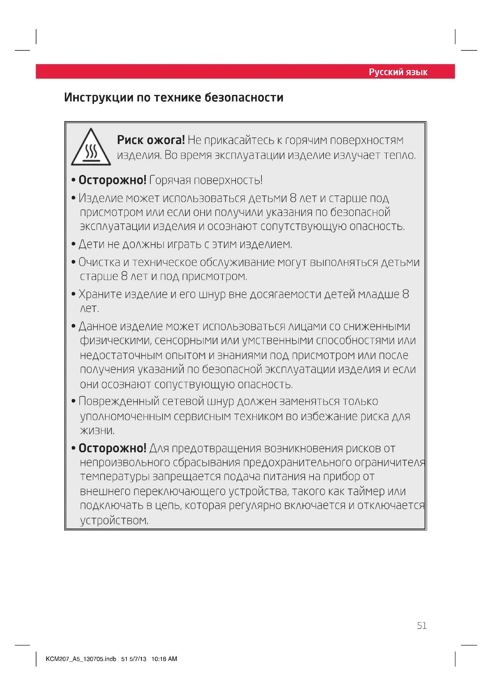 - Осторожно! Для предотвращения возникновения рисков от непроизвольного сбрасывания предохранительного ограничителя температуры запрещается подача питания на прибор от внешнего переключающего устройства, такого как таймер или подключать в цепь, которая регулярно включается и отключается устройством. Инструкции по технике безопасности KCM207_A5_130705.indb 51 5/7/13 10:18 AMРусский язык