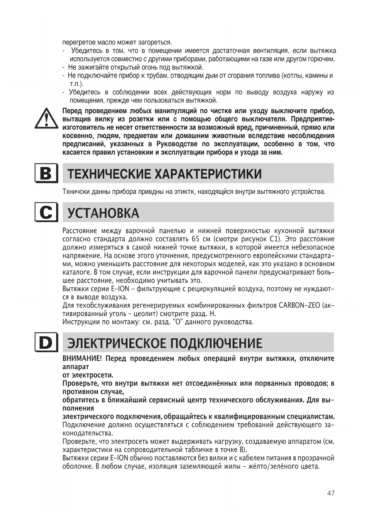 электрического подключения, обращайтесь к квалифицированным специалистам. Подключение должно осуществляться с соблюдением требований действующего за- конодательства. Проверьте, что электросеть может выдерживать нагрузку, создаваемую аппаратом (см. характеристики на сопроводительной табличке в точке B). Вытяжки серии E-ION обычно поставляются без вилки и с кабелем питания в прозрачной оболочке. В любом случае, изоляция заземляющей жилы - жёлто/зелёного цвета.48 На входе в аппарат должен быть установлен защитный выключатель, соответствующий категории III перенапряжения, отвечающий правилам установки страны эксплуатации. Жёлто/зелёный провод заземления не должен отключаться отсекающим выключате-