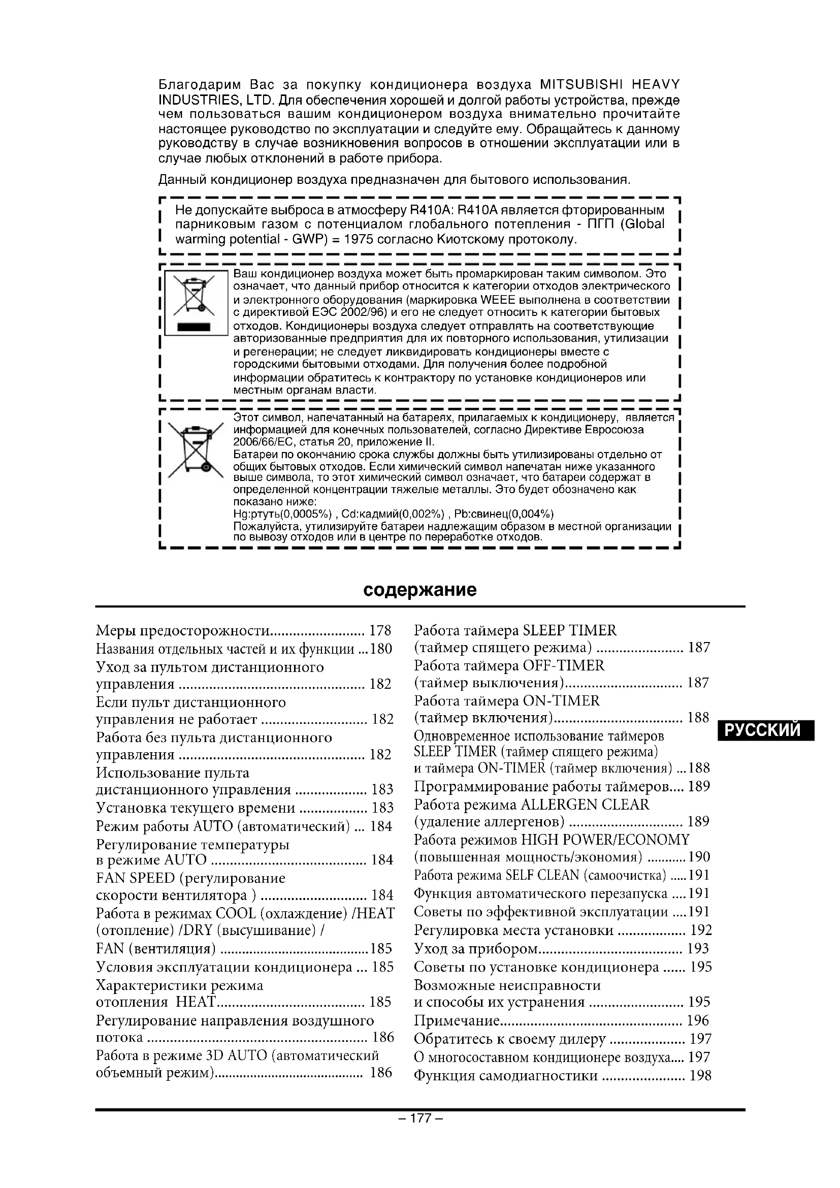 Этот символ, напечатанный на батареях, прилагаемых к кондиционеру, является информацией для конечных пользователей, согласно Директиве Евросоюза 2006/66/EC, статья 20, приложение II. Батареи по окончанию срока службы должны быть утилизированы отдельно от общих бытовых отходов. Если химический символ напечатан ниже указанного выше символа, то этот химический символ означает, что батареи содержат в определенной концентрации тяжелые металлы. Это будет обозначено как показано ниже: Hg:ртуть(0,0005%) , Cd:кадмий(0,002%) , Pb:свинец(0,004%) Пожалуйста, утилизируйте батареи надлежащим образом в местной организации по вывозу отходов или в центре по переработке отходов. RKY012A006_Ru_177-187-Times 11/14/2008, 16:03177– 178 – He подвepгaйтe ceбя длитeльномy воздeйcтвию xолодного воздyxa. Меры предосторожности